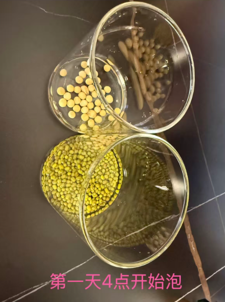 陈女士说,绿豆确实很适合在假期养,8天的时间,孩子完整观察到豆芽冒头、脱皮,接着冒出杆子,长出叶子和根须的过程。