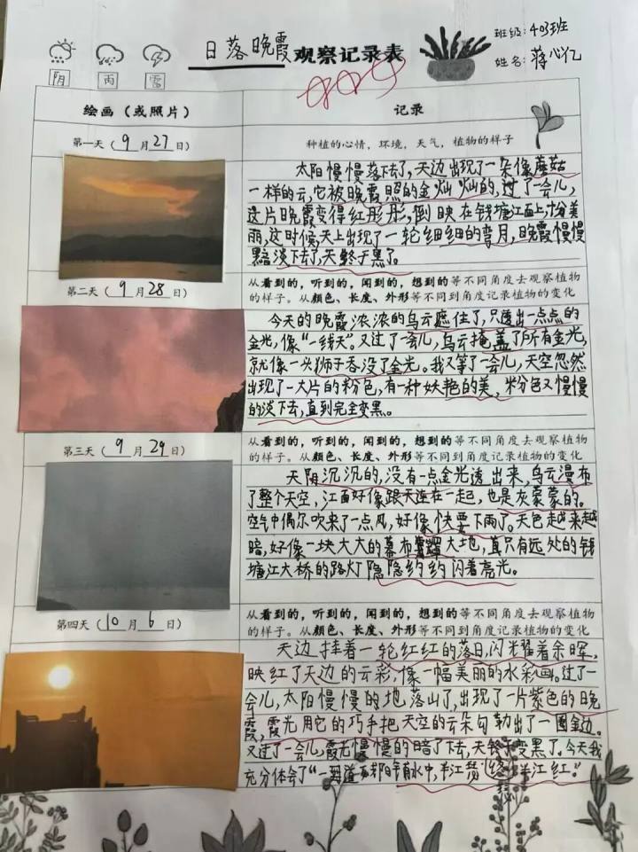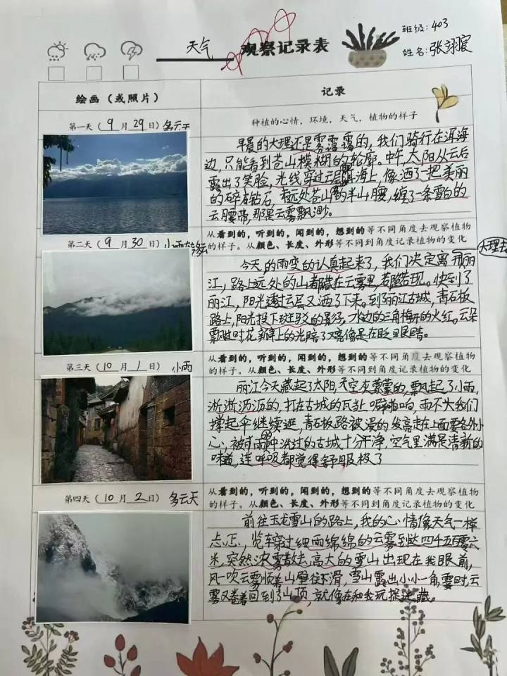朴老师说:“平时生活中,孩子们很少会有连续观察的习惯。小长假期间的观察,让孩子们留下了很多真实、宝贵的素材。回校后我们就会在习作课上对大家的记录进行点评,进一步修改,最后形成一篇完整的观察日记。”