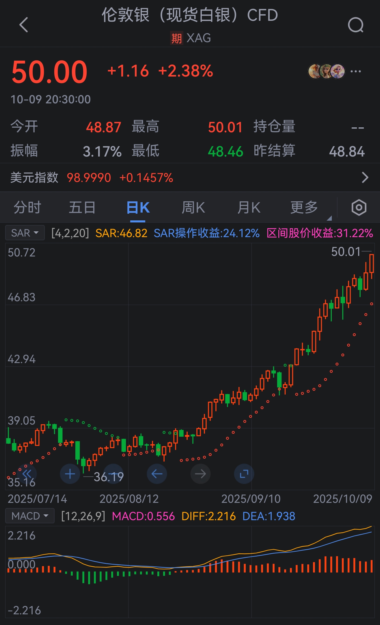 现货白银首次上触50美元整数大关