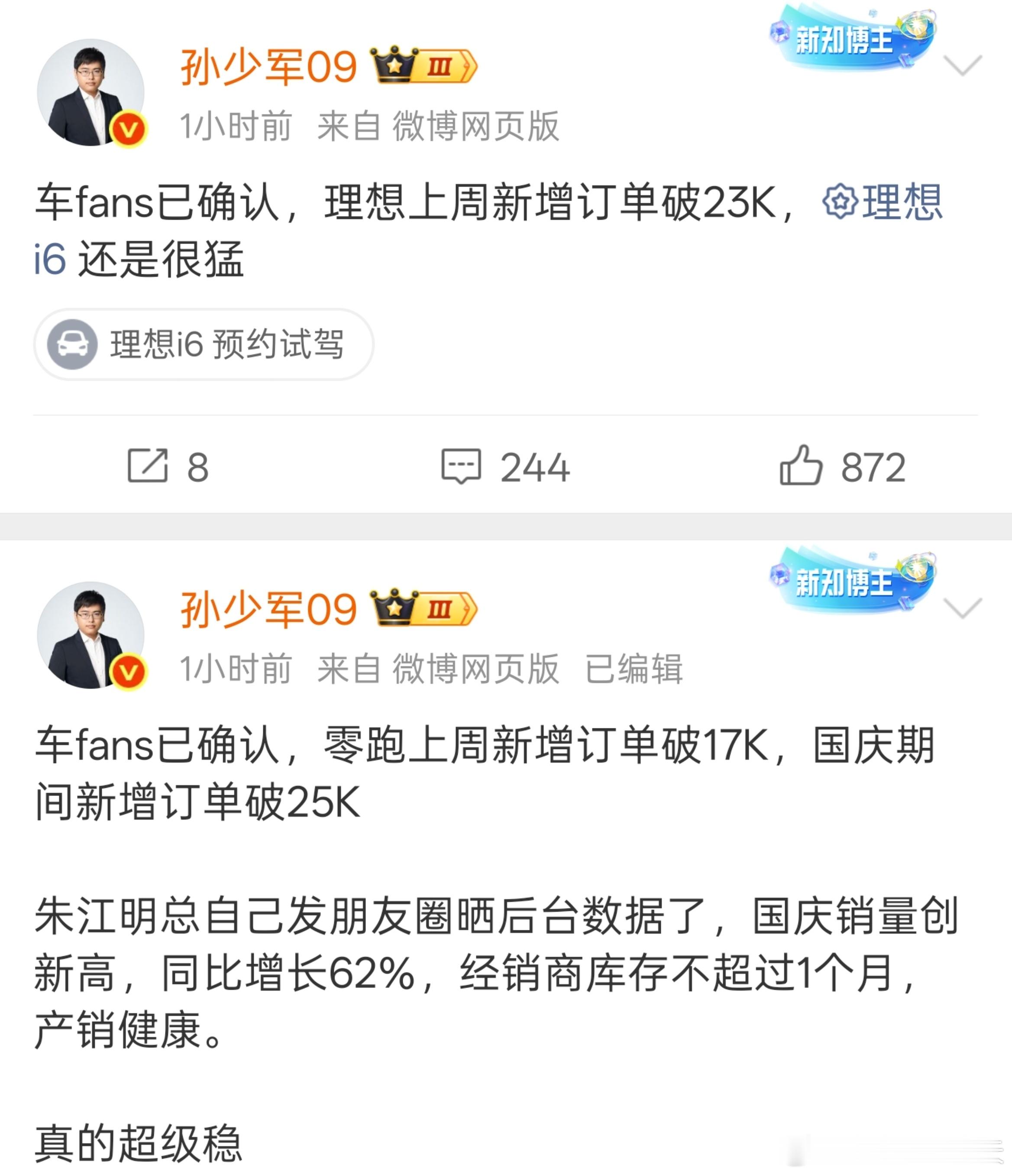 这三家应该是国庆期间新增订单的Top3了吧~鸿蒙智行理想汽车零跑汽车