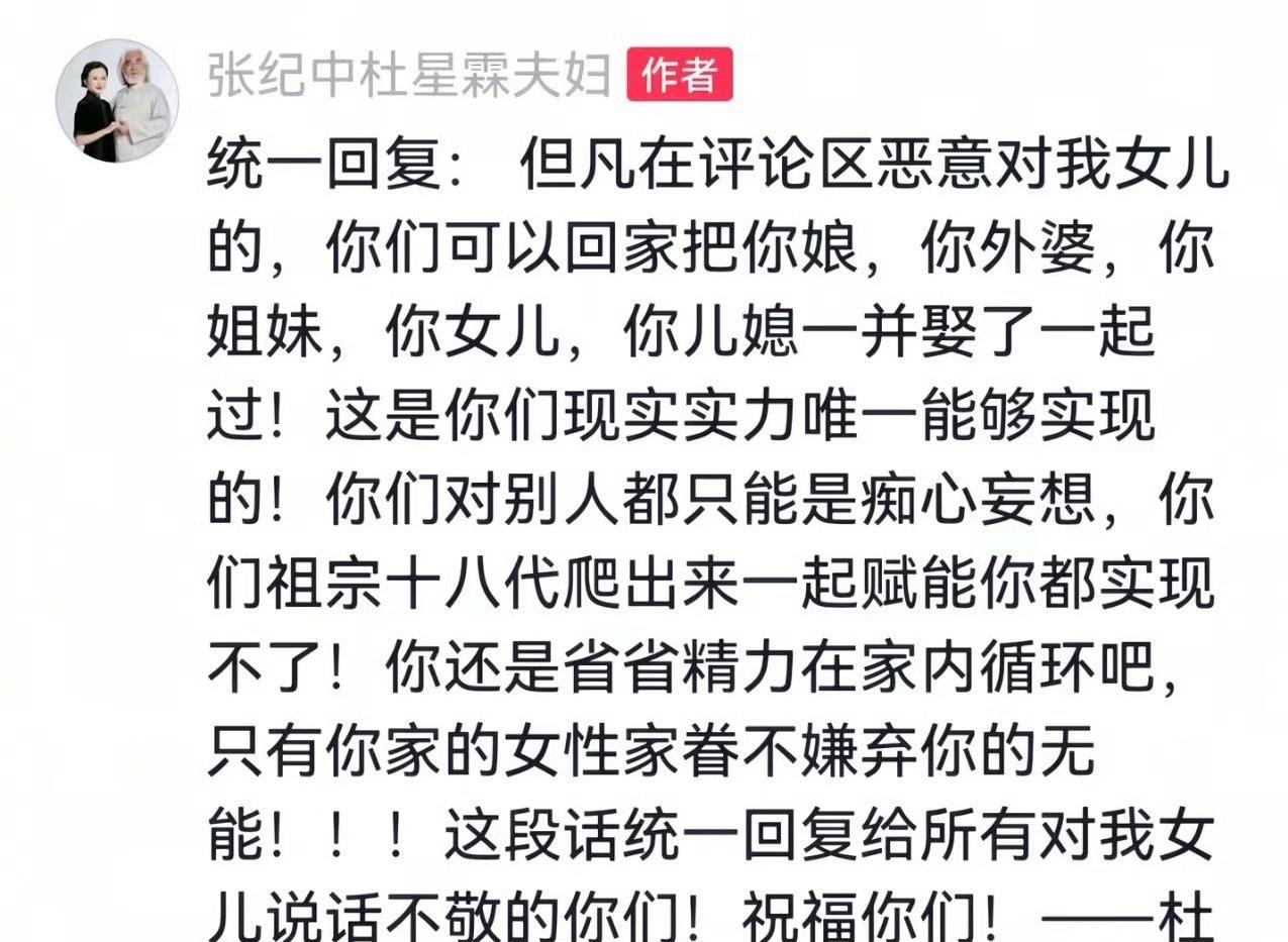 近日,杜星霖和张纪中为小女儿庆祝一周岁生日时,一大群网友对他们的女儿开黄腔,说完当他们的女婿,对此杜星霖直接“杀疯了”,同样用黄腔回怼这些网友。 她让这些开黄腔的人,回去把自己外婆、母亲、姐妹、女儿、儿媳都给娶了,还高高在上的说,这是网友唯一能实现的了,想要娶她的女儿就是痴心妄想! 杜星霖的话可以说十分“毒”了,完全不顾自己公众人物的素养和形象了,但其他路人网友却都表示支持。 因为在网友们眼里,是这群嘴贱的网友先不礼貌了,他们对张纪中和杜星霖不满,可以直接说他们俩,为什么要对一个才一岁的小女孩开黄腔?孩子做错了什么?凭什么要被恶意调侃? 只要是为人父母的,看到网友这些恶意满满的评论后,都会忍不住骂人的,不然连自己的女儿都不护着,那还配当人父母吗? 所以杜星霖这番不顾一切的攻击网友,不仅不惹人反感,反而让人看到了她作为母亲对孩子的爱。 也提醒网友们说话还是善良一点吧,不要把恶意放在一个孩子身上!