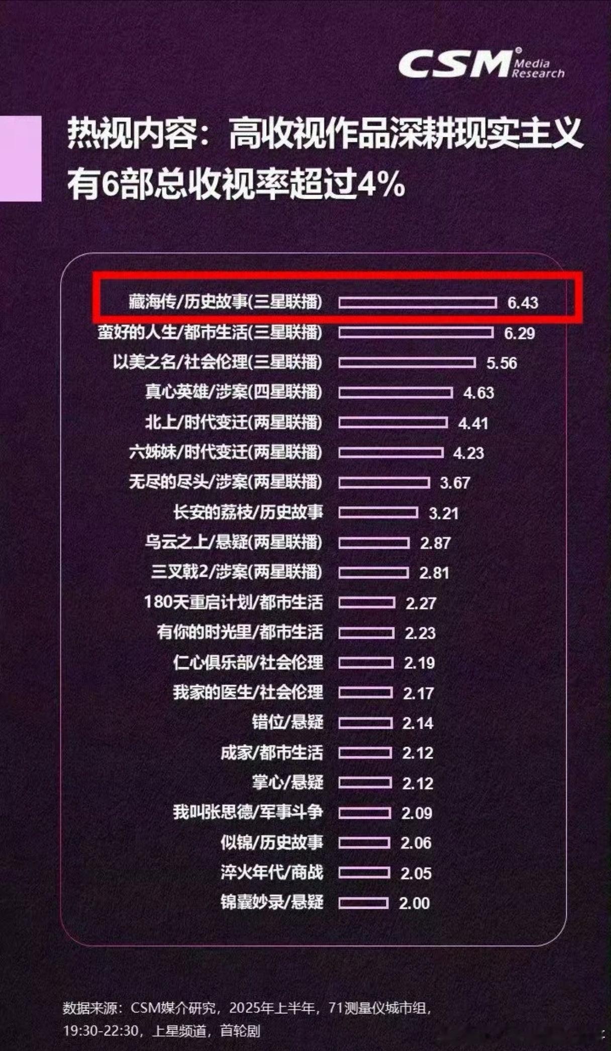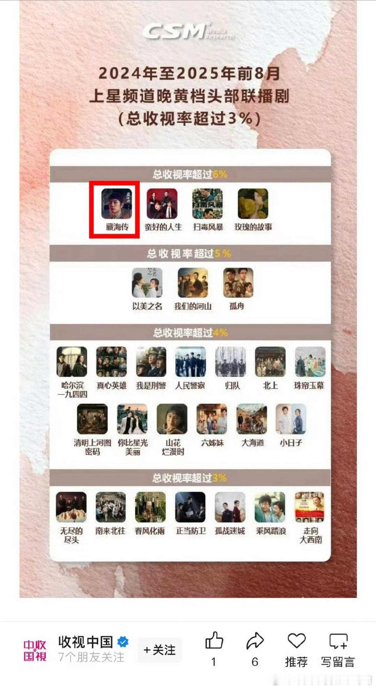 据广电报道,2025年肖战《藏海传》以6.43%总收视率斩获上半年剧王👑,全媒体规模超过218亿人次。24年-25年8月近两年时间,仅有四部剧总收视率超过6%,《藏海传》位列第一👑不愧是台、网、口碑、热度、文化出海的全球大爆剧! [点赞]
