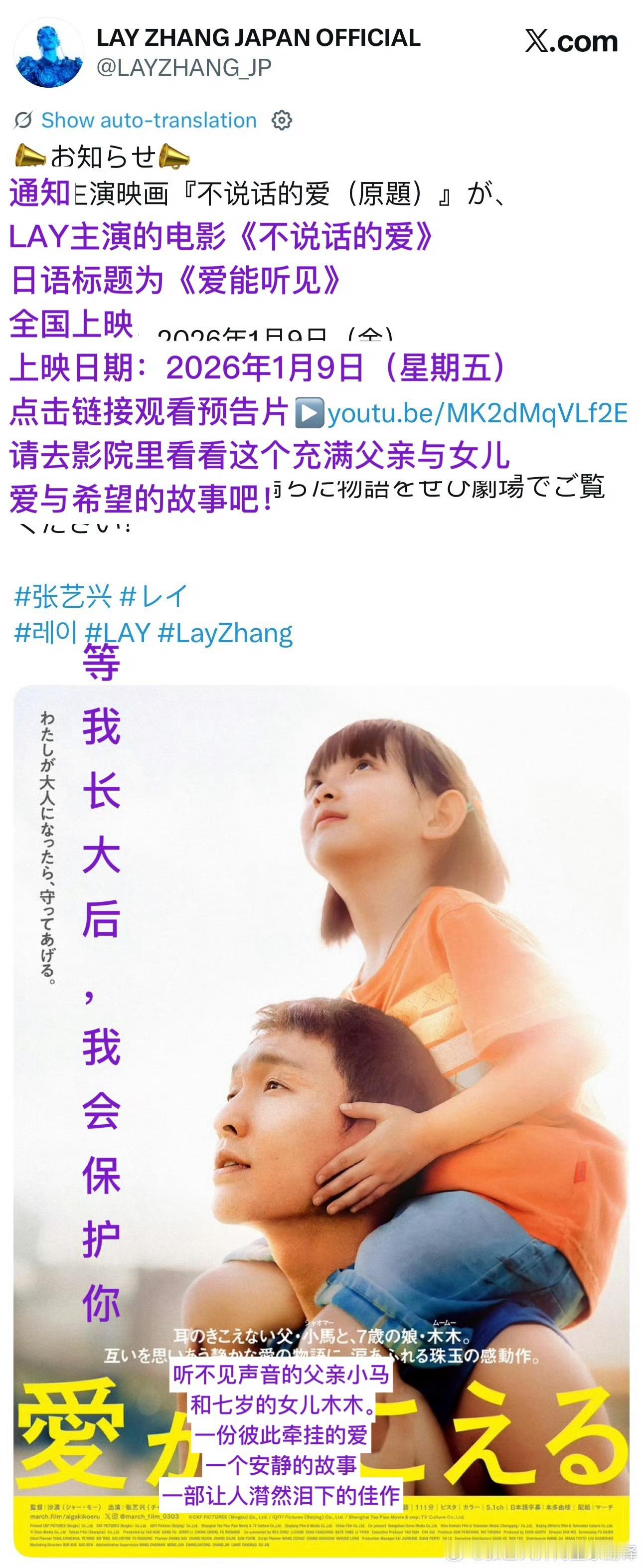 张艺兴电影《不说话的爱》将于1月9日在日本上映,之前是限映,这次是全国上映了!!