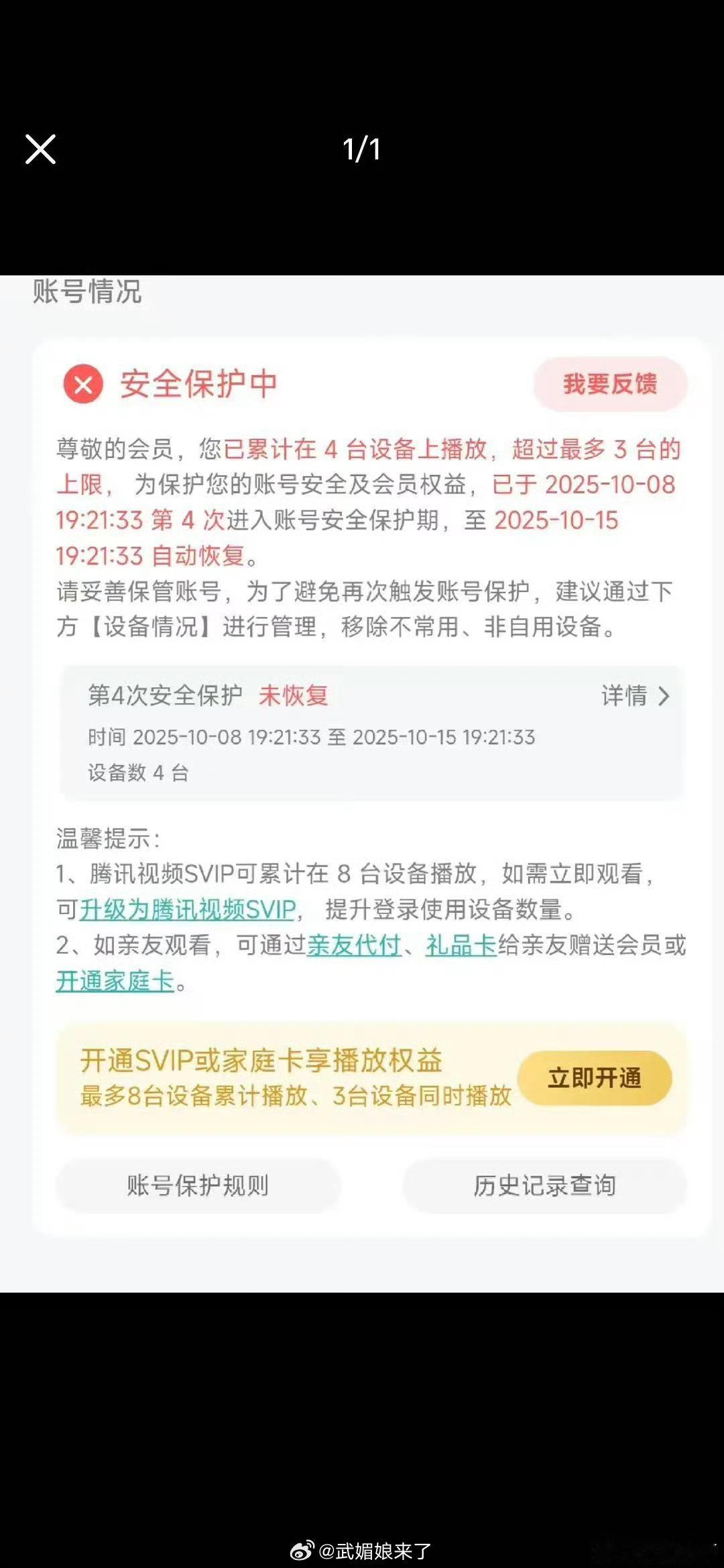 腾讯视频多设备登陆禁看7天有点离谱啊一个月会员也才30天