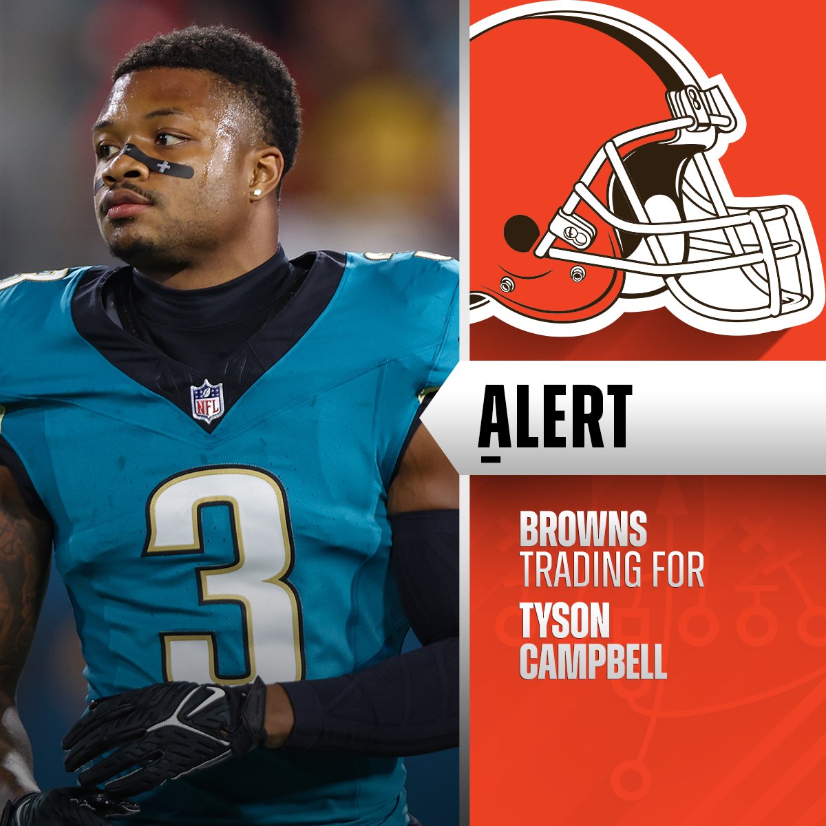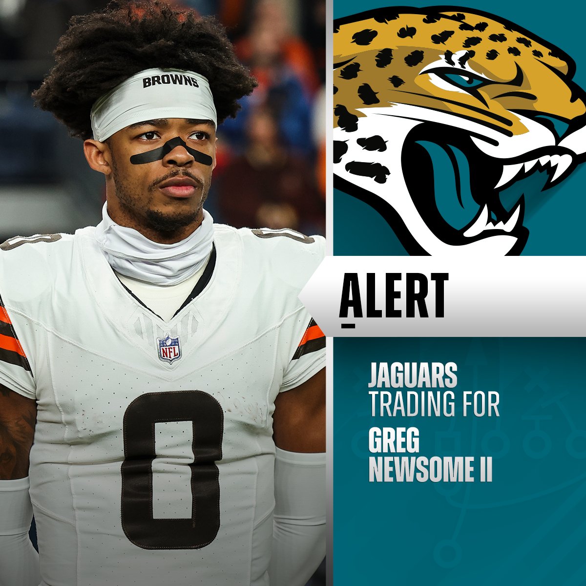 NFL官方X账号发推特报道,美洲虎队将送出角卫泰森·坎贝尔和2026年第七轮选秀权,从布朗队交易得到角卫格雷格·纽瑟姆和2026年第六轮选秀权。(消息源:@RapSheet+@TomPelissero)