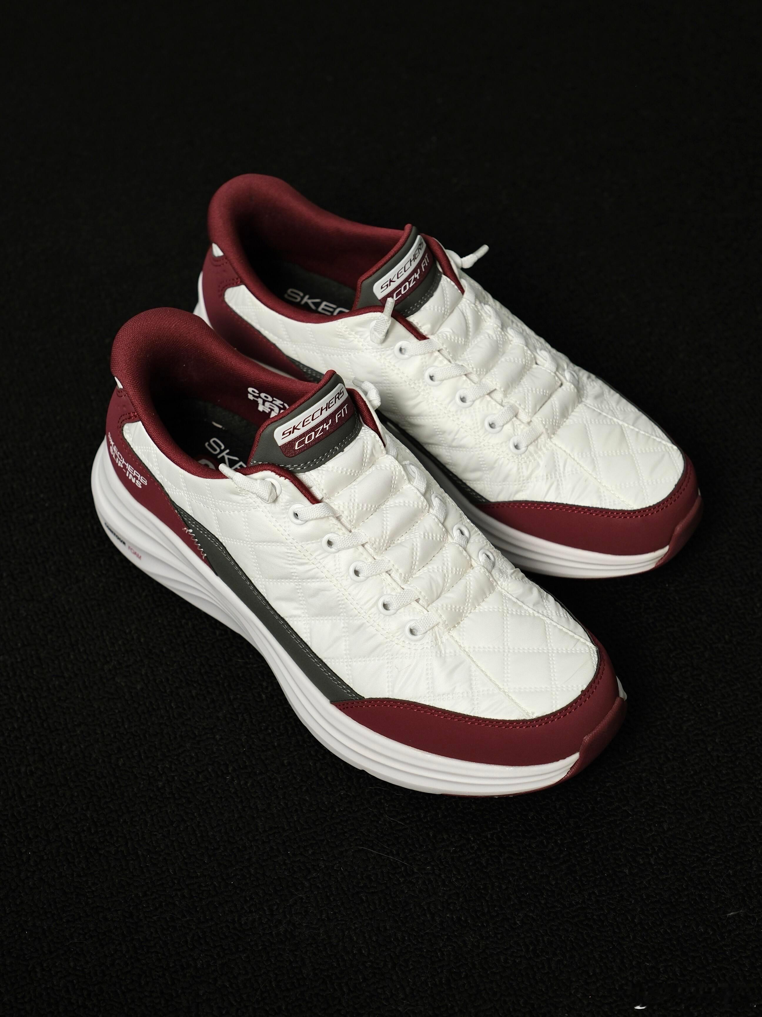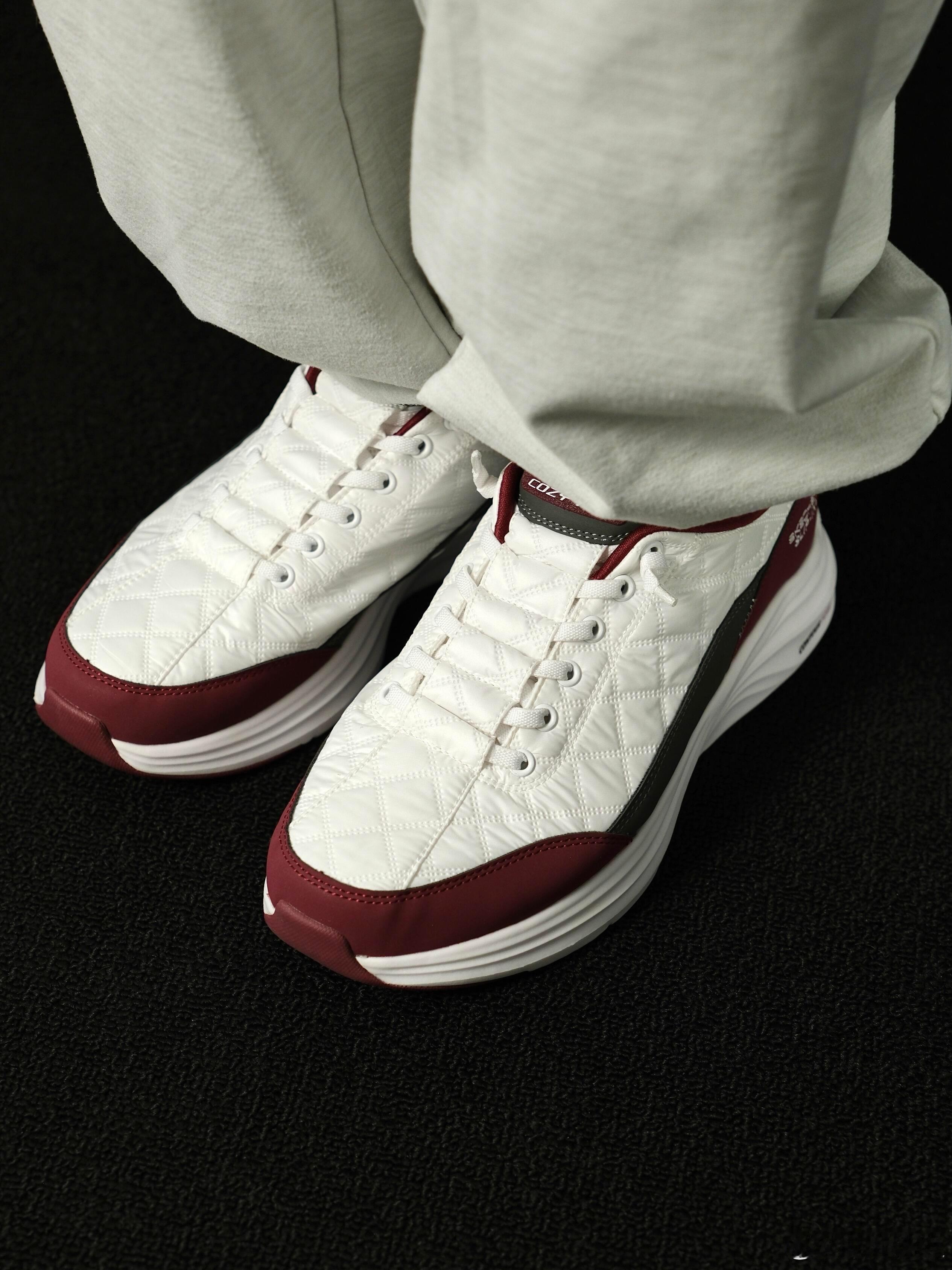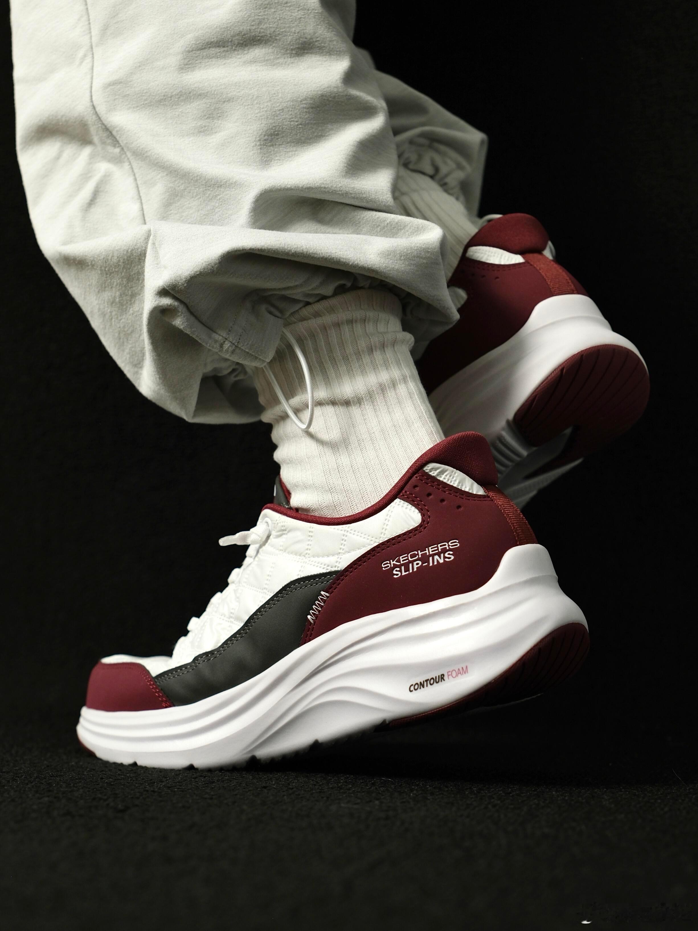 这双斯凯奇运动鞋以经典的黑白红配色打造出强烈的视觉冲击力。白色鞋面作为主调,搭配酒红色块与深灰线条的拼接设计,瞬间提升了整体的时尚层次感。侧身巨大的立体感"S"标识与鞋舌上的"SKECHERS"品牌字样,彰显其鲜明的身份。