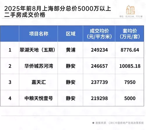 再对比周边二手房价格,2025年前8月,上海5000万以上二手房共成交160套,其中翠湖天地五期成交均价达24.9万元,华侨城苏河湾成交均价达24.6万元,嘉天汇成交均价达23.7万元,中粮天悦壹号成交均价达21.9万元。