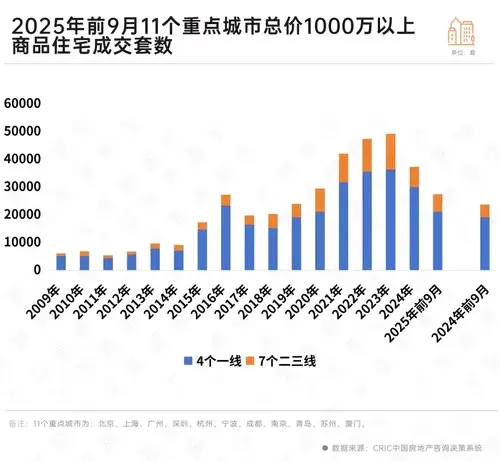 前三季度,11个重点城市总价1000万以上商品住宅共成交27372套,较2024年同期增长15.6%。