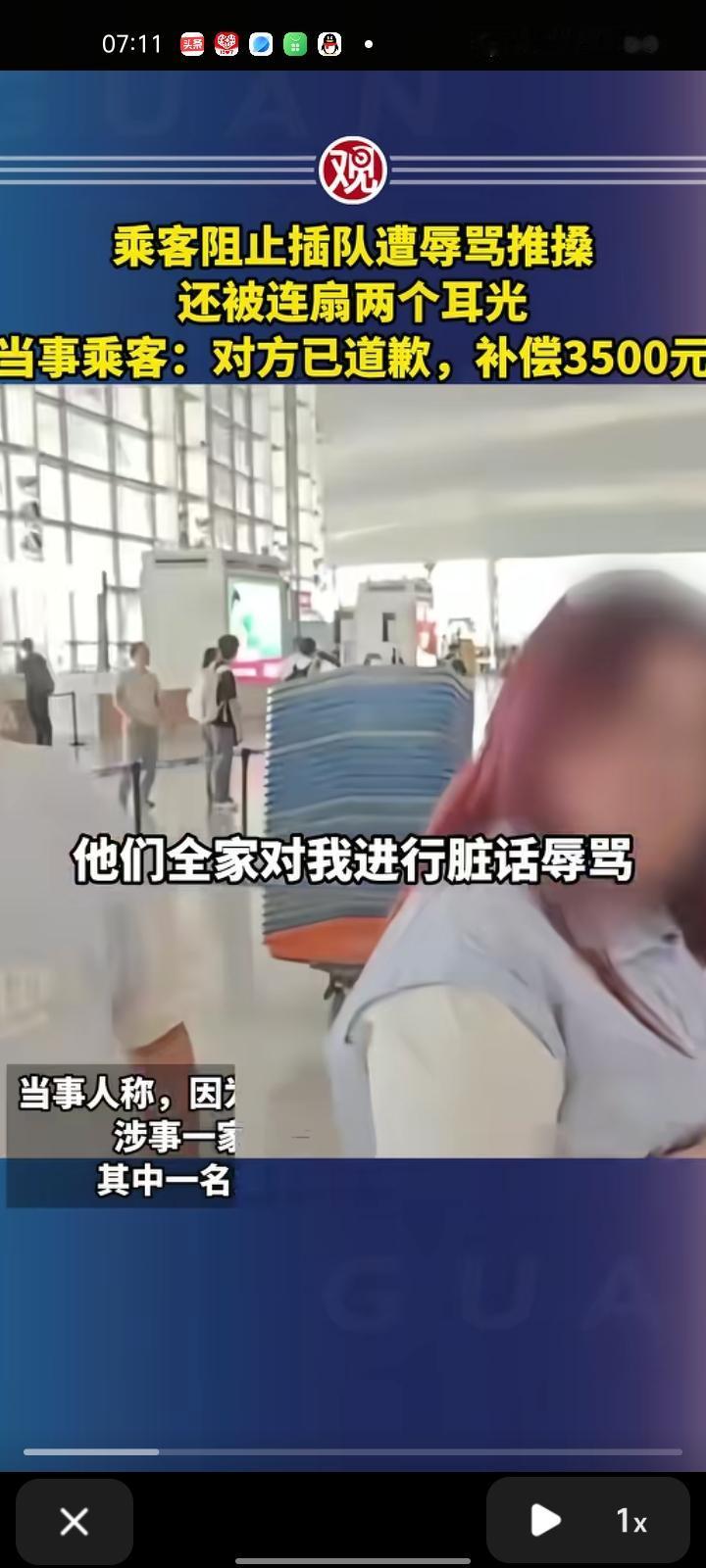10月8日,江苏南京。网友发视频称,自己在值机柜台排队时遇到一对夫妻插队,随即上前制止,他们不仅不听劝阻还动手打其耳光。 经警方调查,确认是插队者一方引发冲突且存在骂人打人行为,戴先生未还手,无需承担责任。最终,双方在警方调解下达成一致,插队者向戴先生诚恳道歉,并支付3500元赔偿,此外还需赔偿戴先生高铁票费用530元。 得知要赔钱后,扇耳光的女子开始嚎啕大哭,其丈夫也低声下气求戴先生谅解并签了和解书。戴先生看他们可怜,便删了视频,但女子出门后又骂骂咧咧,戴先生于是再次曝光了视频。 排队不仅是一种行为习惯,更是公共秩序的具象化体现,是 “人人为我,我为人人” 的基本遵循。如果在机场插队,会破坏公共场所的和谐氛围。 除了警方介入后的调解赔偿,更需要通过社会舆论的引导,让 “插队可耻、暴力违法” 的观念深入人心,让每一个人都清楚:公共场所不是 “法外之地”,不文明行为必然要付出代价。