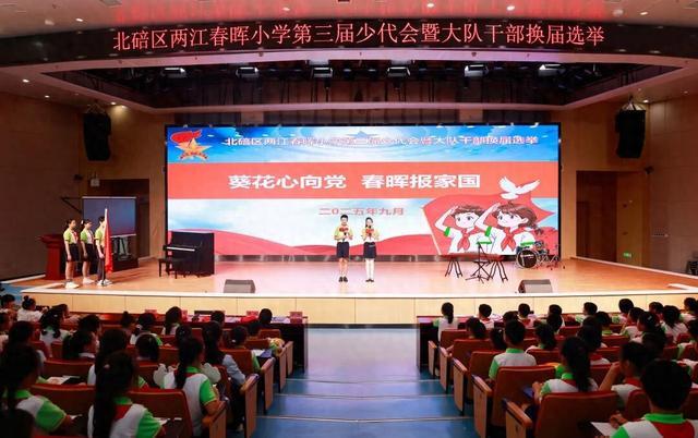 为推动学校少先队事业进一步发展,优化少先队组织架构,提升学校少先队大队干部及全体少先队员的综合素养,2025年9月24日下午,重庆市北碚区两江春晖小学第三届少代会暨大队干部换届选举活动在春晖剧场隆重举行。活动前期,经过中队推荐和初选,56位优秀的少先队员脱颖而出,成为少先队大队干部候选人。
