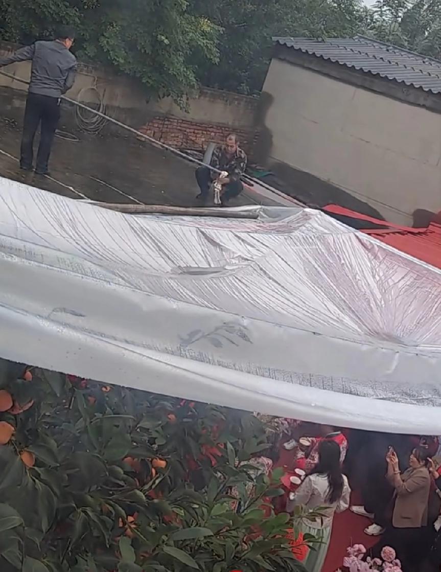 沾沾喜气!10月8日,河北一户人家办婚礼,淅淅沥沥地小雨下不停,院子上方遮雨的塑料顶棚积水越来越多,让人担心会不会压塌了顶棚。 为了婚礼能够正常进行,为了亲友的祝福不被打断,两位大哥爬上了房顶。 其中一位大哥将长长的杆子上绑上毛巾,然后将毛巾伸到积水的地方吸满水,然后再由另一位大哥将水份拧干。循环往复,积水处的水越来越少,两位大哥露出了欣慰的笑容。 网友笑评:“除积水的方法有很多,这一种叫沾沾喜气!”哈哈,果然评论区里卧虎藏龙,这话说的也太有水平了! 婚礼照常进行,祝福从未间断!两位大哥小心翼翼地守护着这场婚礼,令人动容!婚礼暖心一幕 婚礼天气