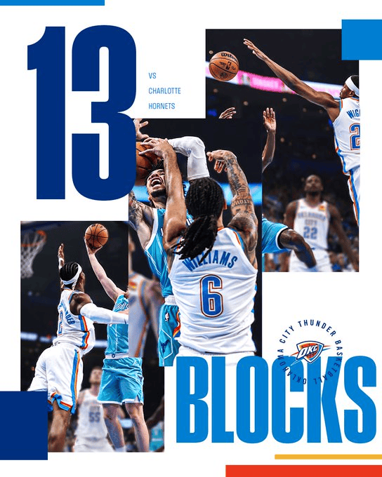 雷霆队分享全场13次盖帽海报并配文:家里正在开热闹派对!