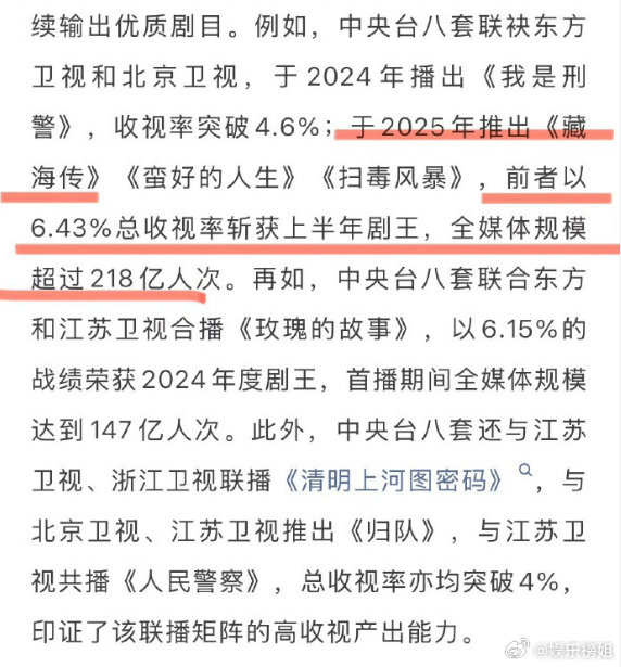 藏海传总收视率超过6%肖战《藏海传》喜报再+1,2024年到2025年8月总收视率超过6%的仅有4部,而《藏海传》排在第一位,且以6.43%总收视率斩获上半年剧王,官方认证的剧王[中国赞]藏海传