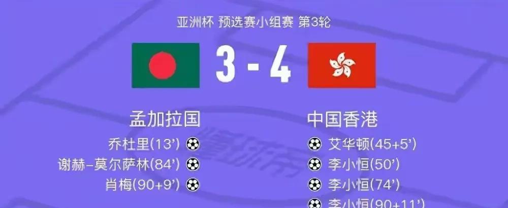 山东泰山李小恒太牛啦!李小恒代表香港队1人独中三元,上演帽子戏法!李小恒补时最后一分钟绝杀进球,助香港亚洲杯预选赛4比3绝杀孟加拉国队,中国香港队拿下一场关键胜利。 三轮过后,中国香港队以2胜1平积7分的成绩排在小组第一,新加坡队1胜2平积5分排第2名。中国香港队有希望闯进亚洲杯决赛阶段比赛。 李小恒在崔康熙时没有得到任何机会,韩鹏上任,李小恒机会来了,他在中超联赛已经打进3球了,李小恒中超进球彻底找回自信,代表中国香港在亚洲赛场闪耀。