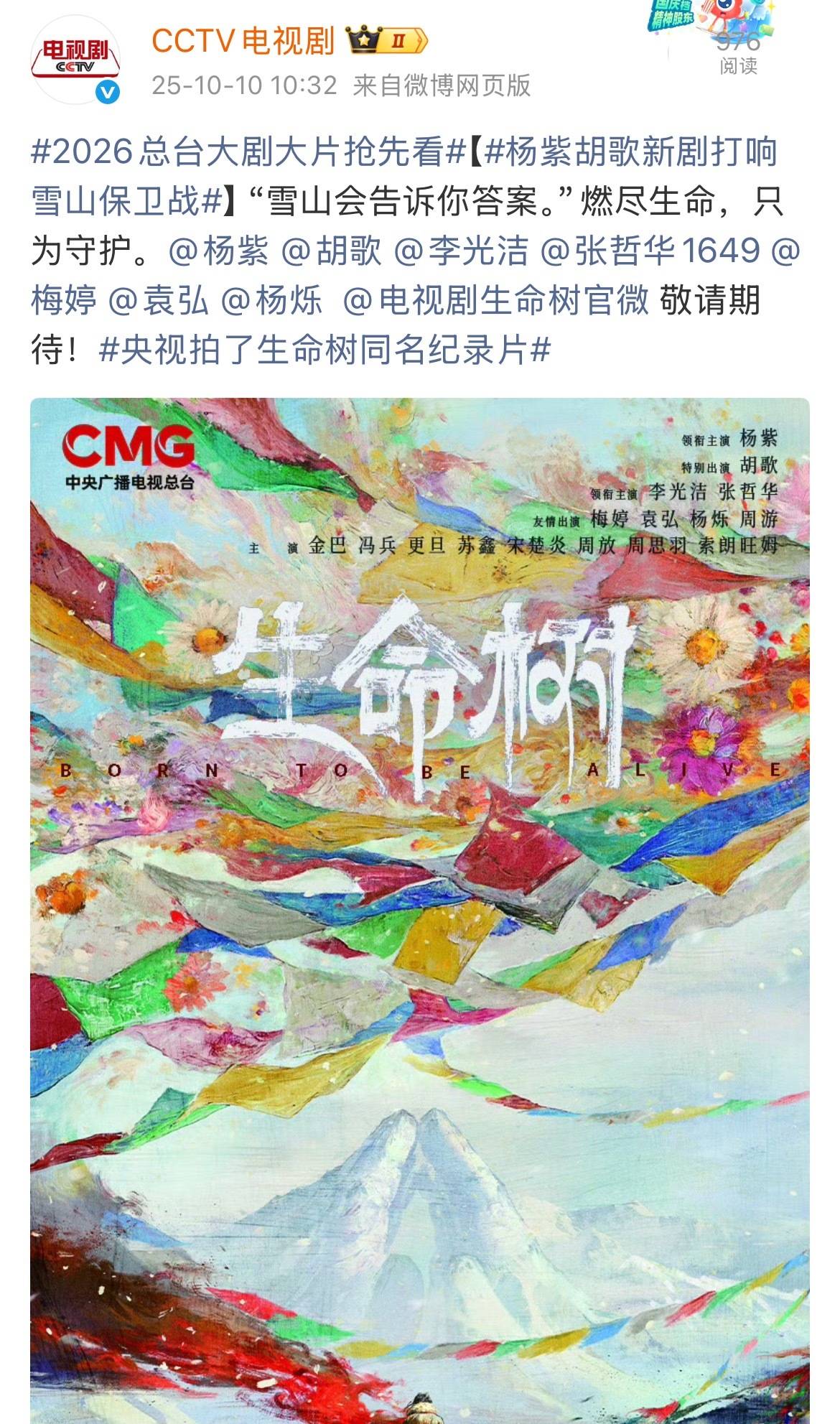杨紫胡歌新剧打响雪山保卫战2026总台大剧大片抢先看 央视拍了生命树同名纪录片