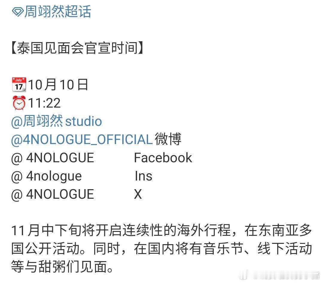 周翊然泰国见面会官宣,接下来还有连续性的海外活动,国内也有音乐节和线下活动[憧憬][憧憬]
