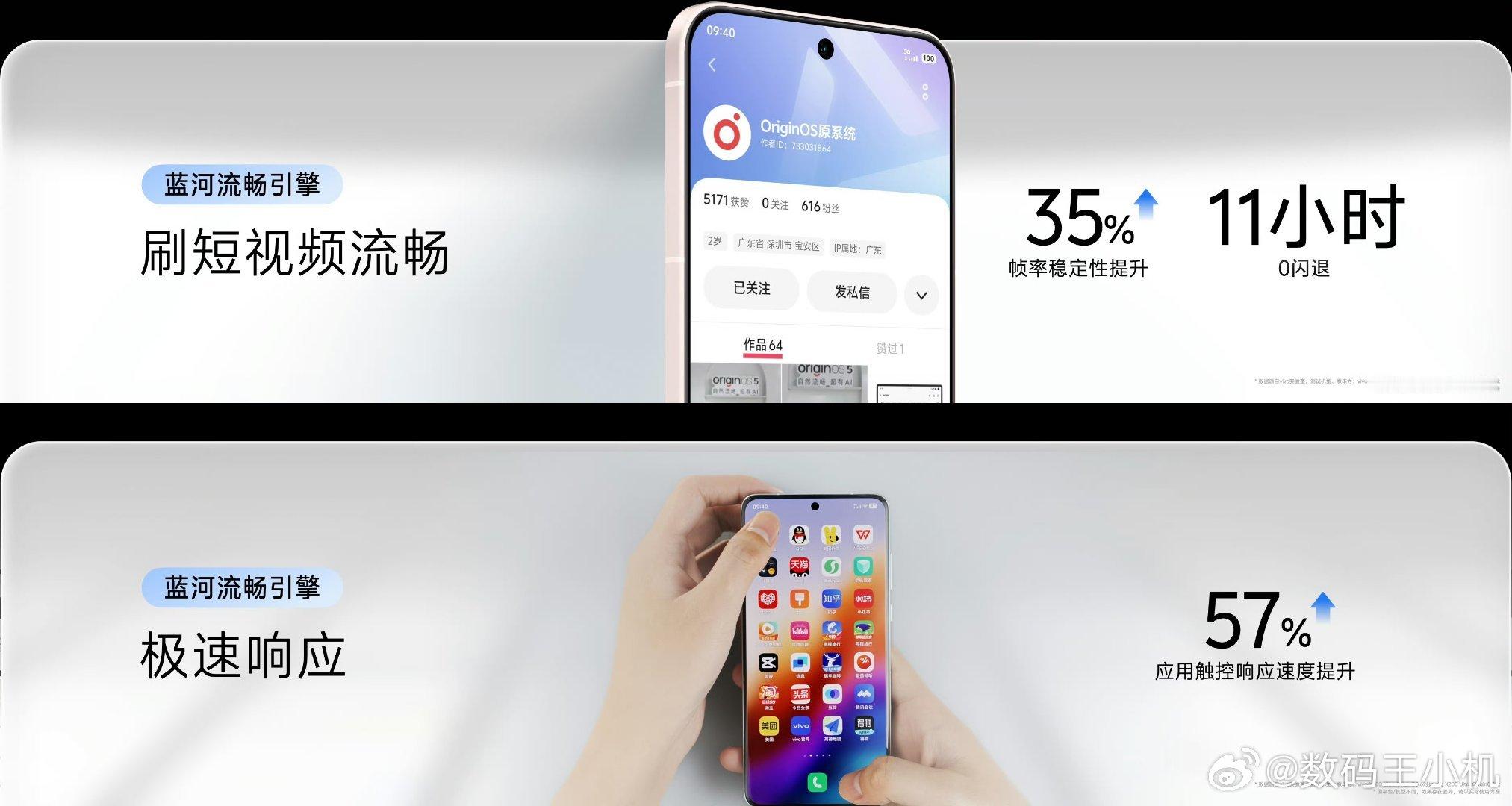 蓝河流畅引擎,也让刷短视频的体验得到大幅提升。以主流的短视频为例,优化之后,长时间刷视频帧率稳定性提升35%,vivo还实现连续刷短视频,11小时不闪退。应用启动速度也再次突破,应用触控响应速度提升57%,比行业最快、还要更快。