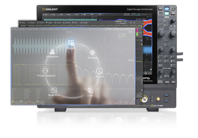 SDS8000A系列支持20余种触发方式,提供4路独立数学运算通道,支持32M点FFT分析及20多种时域运算,支持测量超过60种参数,并进行参数统计值的一键测量。SDS8000A还具备历史模式、搜索和导航、SignalScan、高速模板测试等功能。在总线解码方面,除标配I²C、SPI、UART、CAN、LIN解码外,SDS8000A还支持CANFD、FlexRay、I²S、MIL-STD-1553B、SENT、ARINC429、USB2.0等十余种选配协议解码与触发,覆盖主流工业与通信标准。
