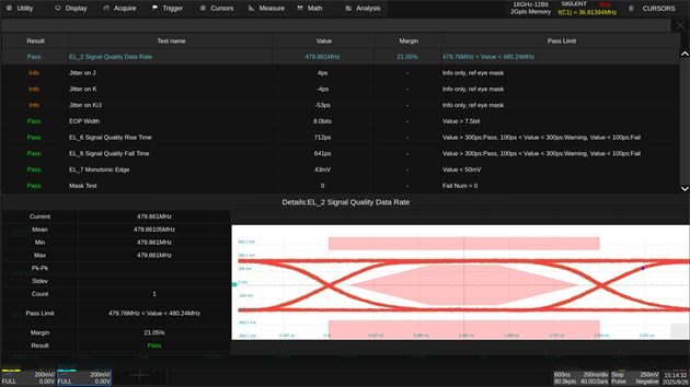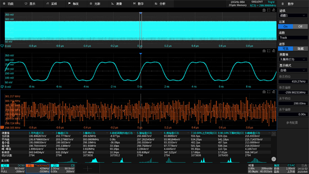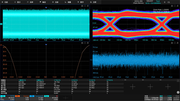 SDS8000A内置专业的眼图与抖动分析功能,能够从高速串行数据中提取时钟并生成清晰、稳定的眼图。系统支持一键式眼图参数测量,包括眼高、眼宽、抖动(RJ/DJ)等关键指标,并集成信号均衡功能,改善波形质量。用户还可根据行业标准或自定义模板进行眼图测试,快速判断信号质量是否符合规范。此外,仪器提供抖动与噪声成分的频谱视图与直方图,便于深入分析各类噪声与抖动来源,为高速接口的调试与信号完整性验证提供完整解决方案。