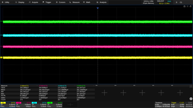 SDS8000A系列采用高性能硬件架构,四通道均可实现176μVrms(typ.)的超低本底噪声,该噪声指标与12-bit高分辨率完美匹配,有效降低仪器自身对被测信号的干扰,即便在高带宽与高速采样条件下,仍能保持信号的纯净度与真实性,为工程师在精密测量及前沿科研应用中提供更可靠的波形保真度。