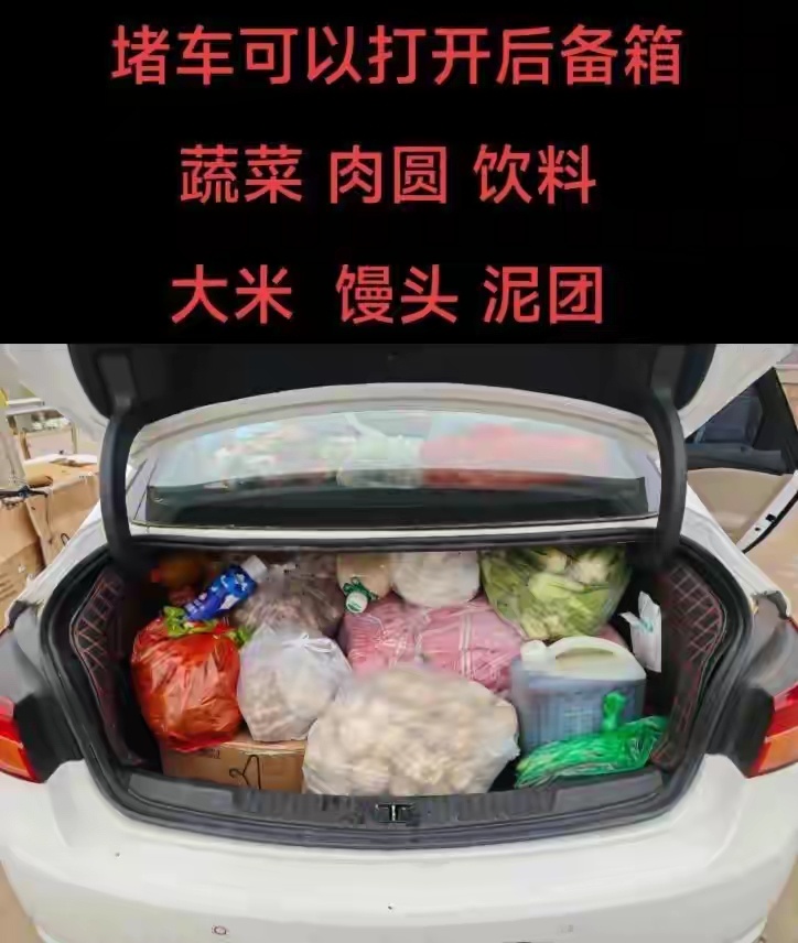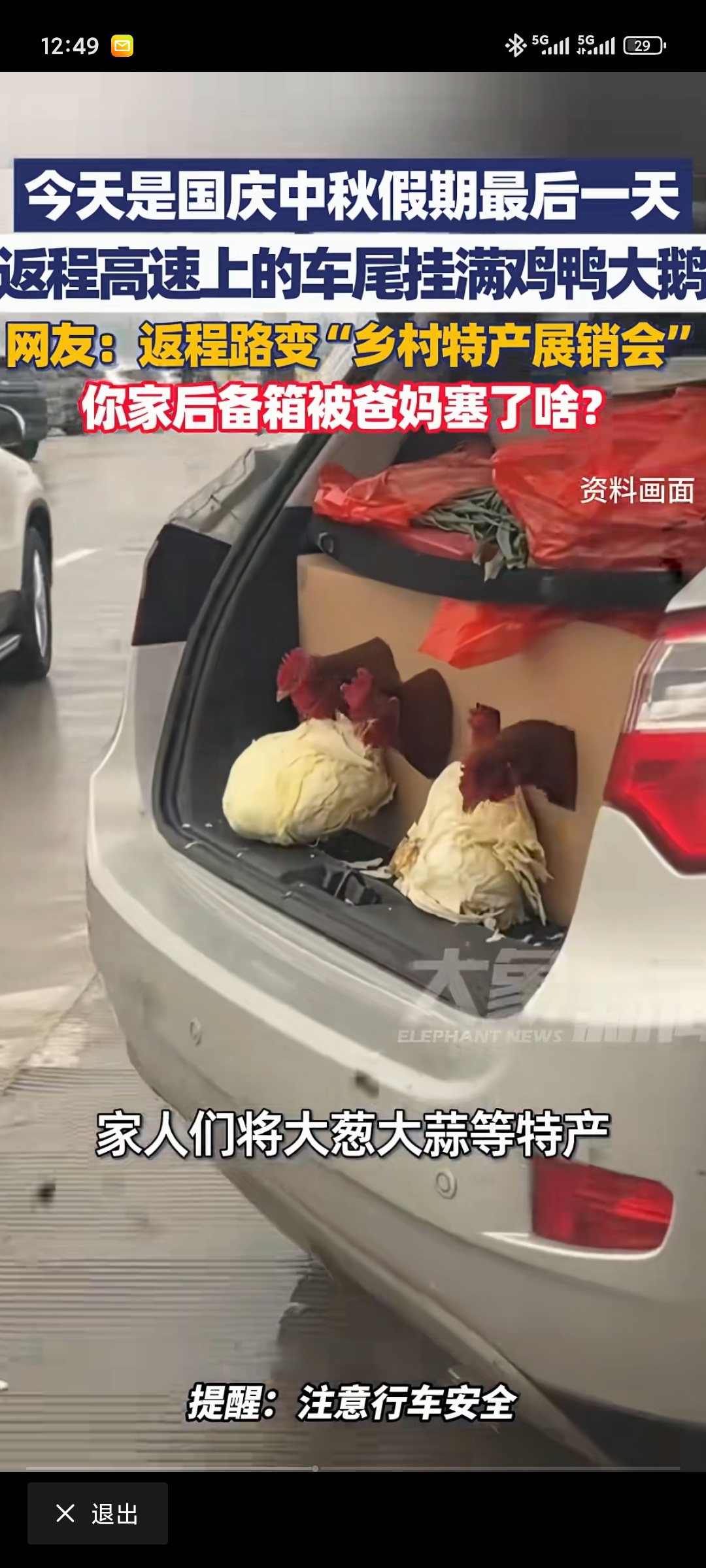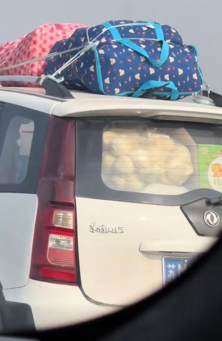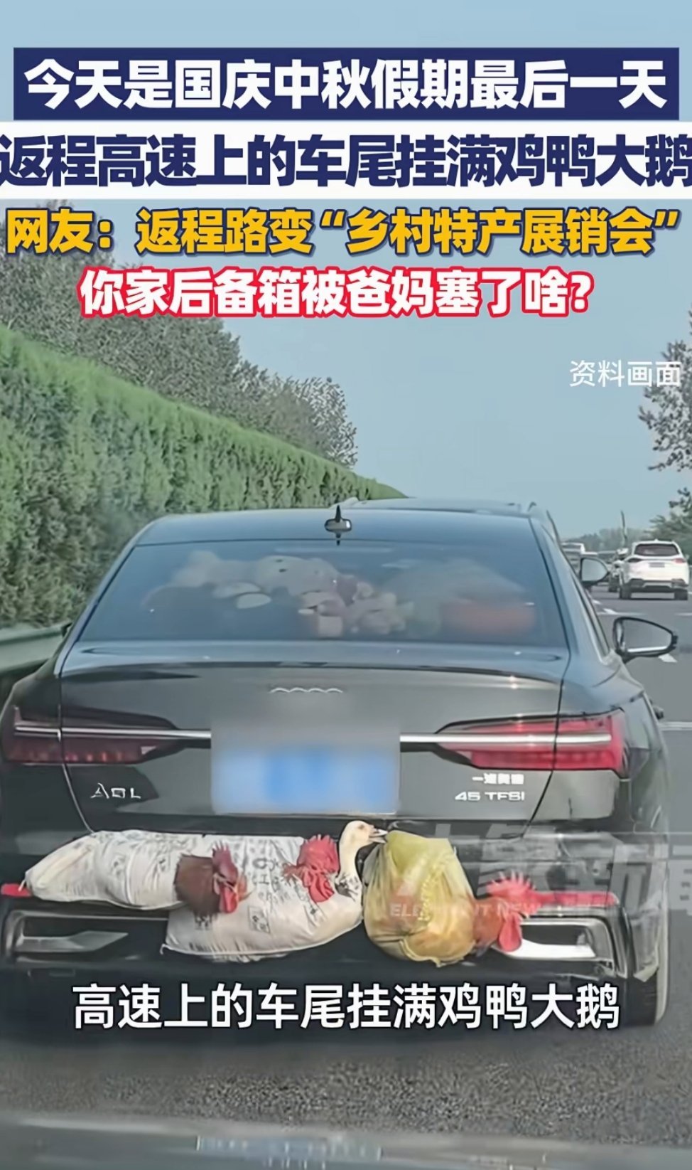 东西太多,车里装不下,甚至直接开启“外挂”模式,真的是字面意义上的外挂,比如我之前看到一只老母鸡挂在汽车尾部。这位车主,仿佛在向全世界炫耀自己是一位被父母宠溺的大孩子。