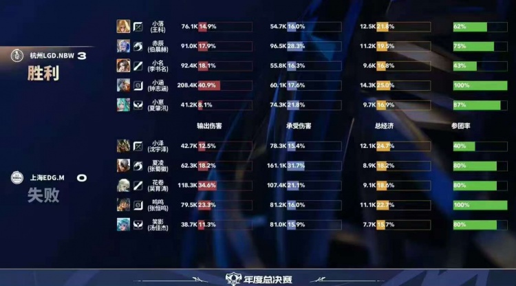 直播吧10月10日讯2025KPL年度总决赛本场比赛是由杭州LGD.NBW对阵到上海EDG.M!第一局:双方前期互有来回,后期LGD凭借蹲草成功抓到EDG掉点,LGD成功拿下首局!第二局:LGD前期拿到优势后EDG想要抓边止损但是被LGD反制,LGD控下主宰后带着兵线推掉水晶!第三局:前期EDG凭借夏侯的强势拿到优势,但是中期LGD凭借抓掉点打赢团战,LGD成功拿下胜利!