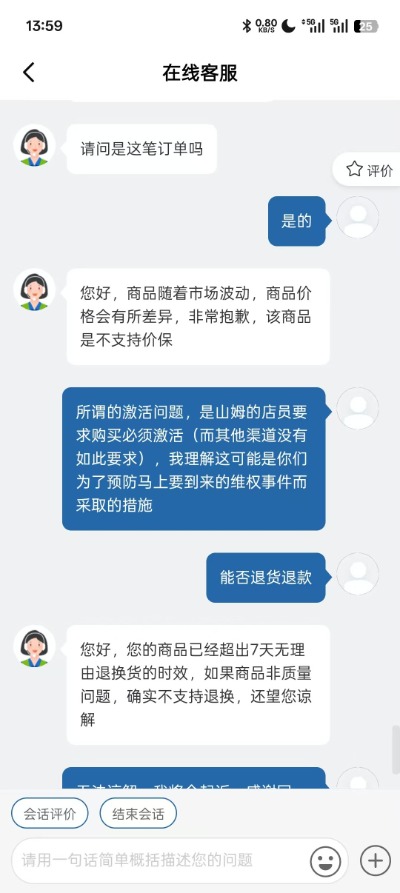 随后,崔灿与山姆客服沟通售后。根据崔灿提供的沟通记录,大皖新闻看到,山姆在线客服表示“商品随着市场波动,价格会有所差异,该商品不支持价保,且已超出7天无理由退换货时效。”