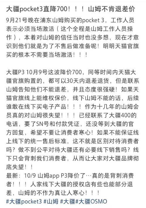 大皖新闻记者搜索社交平台看到,类似的消费者还有不少。比如,一名江苏消费者发帖子称,自己10月5日在山姆购买Pocket3,要求现场激活,降价后,其拨打门店客服,被告知没有保价服务。上海一名消费者则于9月21日在浦东山姆门店购买的Pocket3,也同样被拒退差。