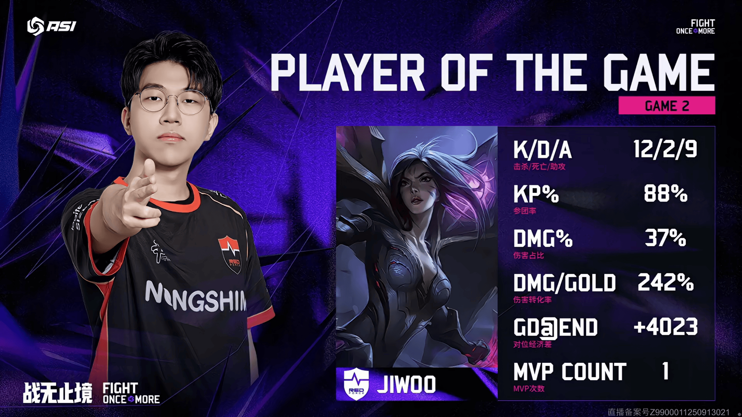 Jiwoo卡莎打出12/2/9战绩,拿下NS对阵WBG第二局MVP