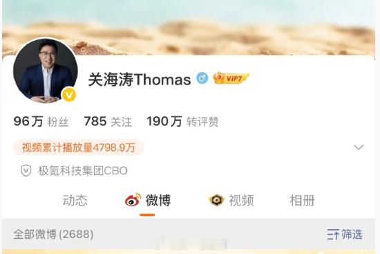 关海涛已将其微博名从“极氪关海涛”改为“关海涛 Thomas”,移除“极氪”标识,但认证信息仍保留“极氪科技集团CBO”。极氪关海涛离职