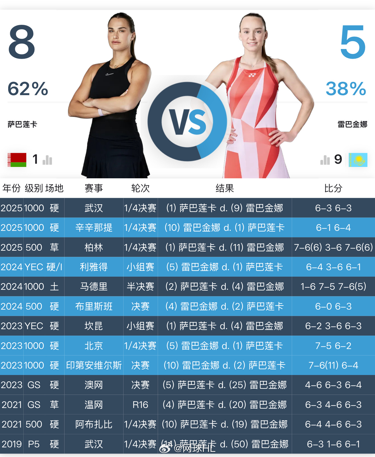 萨巴伦卡以6-3 6-3战胜莱巴金娜,在武网20战全胜,晋级半决赛,将两人交手记