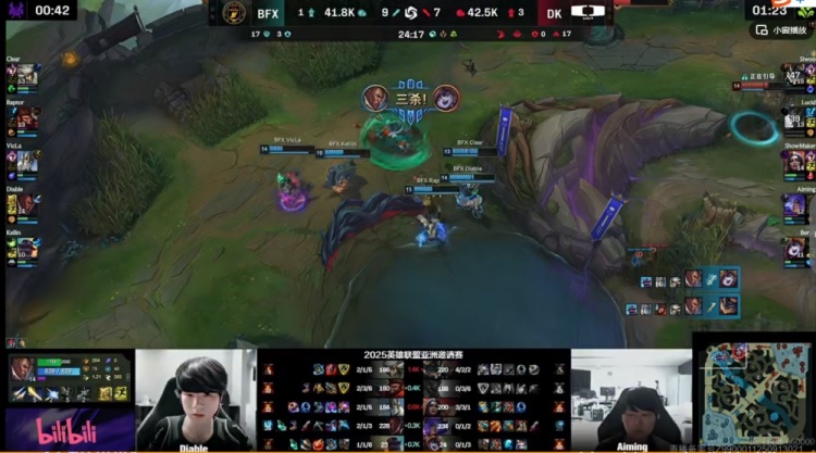 [24:03]DK开打厄塔汗,但是Raptor猴子转大搅乱了DK的阵型,VicLa加里奥嘲讽三个帮助Diable卢锡安打满了输出!这波虽然DK拿下厄塔汗,但是Diable卢锡安三杀!BFX打了个0换3!