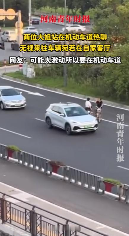 “自作孽不可活!” 近日,一位大妈骑着自行车在马路上遇到了另一位大妈,谁知两人刚停下自行车,就直接站在马路正中间拉开了话匣子,连旁边汽车按的喇叭声都像没听见一样。 视频拍摄者后来跟极目新闻记者说,他当时正开着车准备去接孩子放学,走到这条双向四车道的路上时,突然发现前面的车都在慢慢挪,凑近了才看到是两位大妈堵在快车道上聊天。 这条马路是当地挺繁忙的一条路,每天早晚高峰都有不少通勤车经过,路边还立着 “禁止行人在机动车道停留” 的蓝色警示牌,不知道两位大妈是不是没注意到。 有经常走这条路的司机在网上留言,说这段路之前就发生过一次剐蹭事故,就是因为有行人突然跑到快车道,现在看到大妈这样站着,心里都跟着紧张。 翻开《中华人民共和国道路交通安全法》第 62 条能看到,行人通过路口或者横过道路,应当走人行横道或者过街设施,在机动车道内停留显然是不符合规定的。 当时有辆公交车经过,司机为了绕开两位大妈,不得不往旁边的车道并线,结果后面的小轿车差点没反应过来,急刹车的声音在好几米外都能听到。 拍摄者说他大概观察了两三分钟,期间至少有二十多辆车从大妈旁边经过,有的司机还摇下车窗提醒了一句,但大妈们只是回头看了看,接着又继续聊天。 有交警部门的工作人员在接受采访时提到,行人在机动车道内停留,会让司机的预判时间缩短,尤其是在车流密集的时候,很容易引发连锁事故。 之前也有媒体报道过类似的事,去年在某城市,一位大爷在机动车道上和熟人聊天,被一辆避让不及的电动车撞倒,不仅自己摔了伤,还让电动车车主也受了惊吓。 其实两位大妈要是想聊天,旁边不到一百米就有个小区的休闲广场,那里有长椅还有遮阳棚,比在马路上安全多了,也不会影响别人通行。 现在很多社区都会定期组织交通安全宣传活动,专门给老年人讲马路通行的注意事项,要是两位大妈能参加一次,说不定就不会做这种危险的事了。 还有网友说,有时候看到家里的老人出门不注意交通安全,都会反复叮嘱,毕竟马路上车多速度快,万一出点事,后悔都来不及。 大家平时出门的时候,有没有遇到过有人在马路上停留聊天的情况呀,当时你是怎么处理的呢。 信息来源:《两位大姐站在机动车道热聊,无视来往车辆宛若在自家客厅》极目新闻