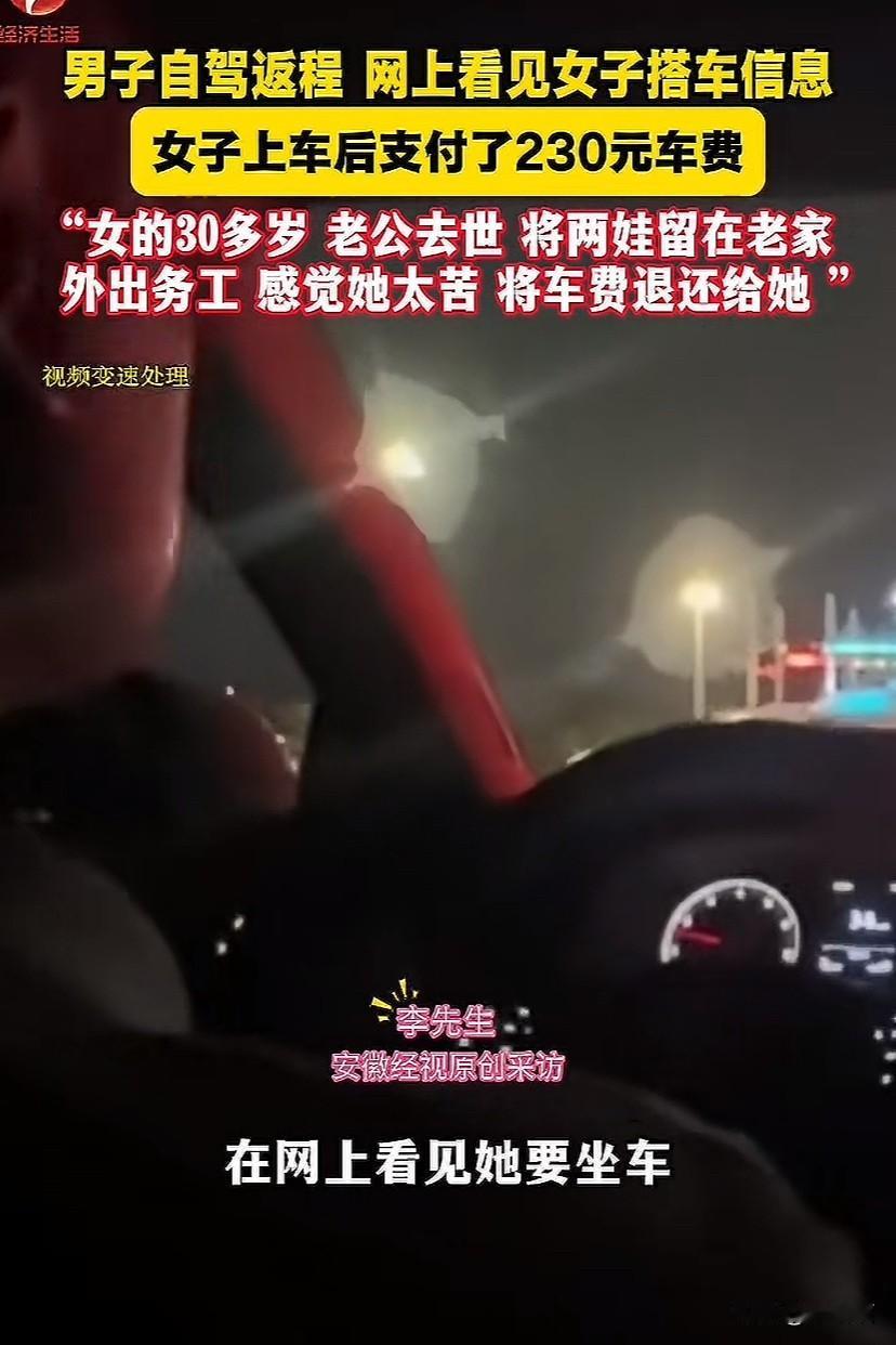 河南民权,男子自驾返程,在网上看到女子要搭车的信息,想着赚个油钱,女子上车后付了230元车费。女子和孩子视频通话后,男子心生怜悯,把车费退给女子。 李先生过节回到河南老家,节后要返回浙江宁波慈溪去上班。由于路途较远,李先生想着要是有人搭顺风车,自己也能赚个油费。 于是,李先生就在网上说了一嘴。刚好,他在刷视频时看到有女子要搭车的信息。 李先生看到后就和女子联系,经过沟通得知,女子的家和李先生的家距离不远。而且她也要回去宁波那边上班,这路线刚好和李先生的返程路线一样。 李先生和女子说好路费和时间后,李先生和另外两个朋友开车到女子的家里接她。女子也很守信用,在李先生接她上车后,她就把230块钱的路费给付了。 看到女子如此爽快,李先生想着这下油费算是有了着落。 在开车的过程中,女子的孩子给她打来视频。视频聊天中女子的两个孩子因为不舍得妈妈外出打工,在视频的那一头觉得稀里哗啦的。看到孩子哭成这样,女子的心里也不好受。 挂了视频后,李先生和女子在聊天中得知:女子今年30多岁,丈夫去年离世。家里有两个孩子,大的13岁,小的5岁。 在女子的丈夫去世后,挣钱养家的重任就落在女子的肩上,她把两个孩子放在家里给老人带,她外出打工。 知道了女子的事情后,李先生的心里特别不是滋味。觉得她一个女子上有老下有小的,特别不容易。 李先生决定把230块钱的路费退给女子,他觉得虽然自己也不富裕,但是自己挣钱比女子容易。 本来女子觉得自己坐车给路费是应该的,在李先生退路费回来时,她还不想要。但李先生坚持不收,女子这才收。李先生把女子安全送到她打工的厂子门口才离开。