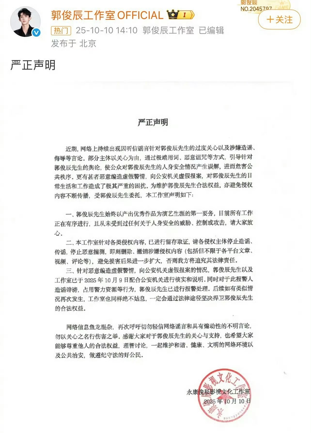 前几天郭俊辰过生日的视频被网友误解读为他在“求救”,现在郭俊辰工作室发声明辟谣。