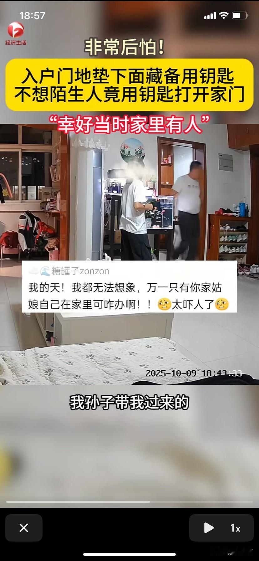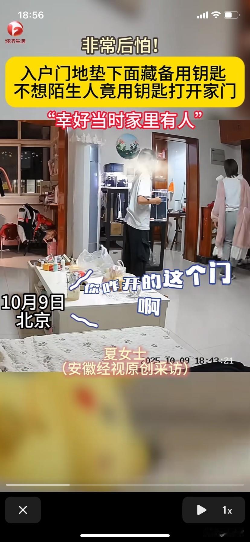 北京,房主出门经常把钥匙锁在家里,留了一把备用钥匙放在门口的脚垫下。晚上房主在家玩手机时房门突然被打开。房主:太危险了,以后不能把钥匙放在门口。 10月9日晚上快七点的时候,夏女士坐在家里的沙发上玩手机时,房子的大门突然被打开。夏女士听到声响抬头看过去是一位不认识的老人站在自己家门口。 老人看到家里有人,他问:哎,有人啊?夏女士从沙发上站起来走向门口想看看怎么回事。毕竟是一个陌生老人拿钥匙打开了自己家的门。 看到夏女士后,老人问:是不是你们卖房子啊? 夏女士说不是。老人听后很淡定的说:我以为是这屋呢,是我走岔了。说完,老人想离开。 夏女士问老人是怎么开这门的?老人说这门口的脚垫下有钥匙,我看到了就拿钥匙开了。 女主人很是震惊,她说老人:那你也不能随便拿钥匙开别人的门啊?看到女主人震惊,老人赶紧道歉说对不起,还说他们准备买房,是孙子把他带过来的,他也住这一块。 这时在里屋的男主人听到二人的对话后走过来问老人:你怎么知道我们的钥匙是放在脚垫底下? 老人说:我以为这里有垃圾,搬家呢,就把脚垫拿起来看了一下,就看到钥匙了。我是二期那边的,对不起啊。说完话,老人让夏女士把钥匙拿进去,他转身离开。 夏女士把钥匙拿回来后出了一身冷汗,惊叹这太危险了。因为把钥匙放在家门口的脚垫下只有家里人才知道。没有想到被一个人陌生老人发现了,而且还轻易的把门打开。 夏女士想起这事就觉得后怕,幸亏当时家里有人。夏女士和丈夫说以后再也不敢把钥匙放在门口的脚垫下面。