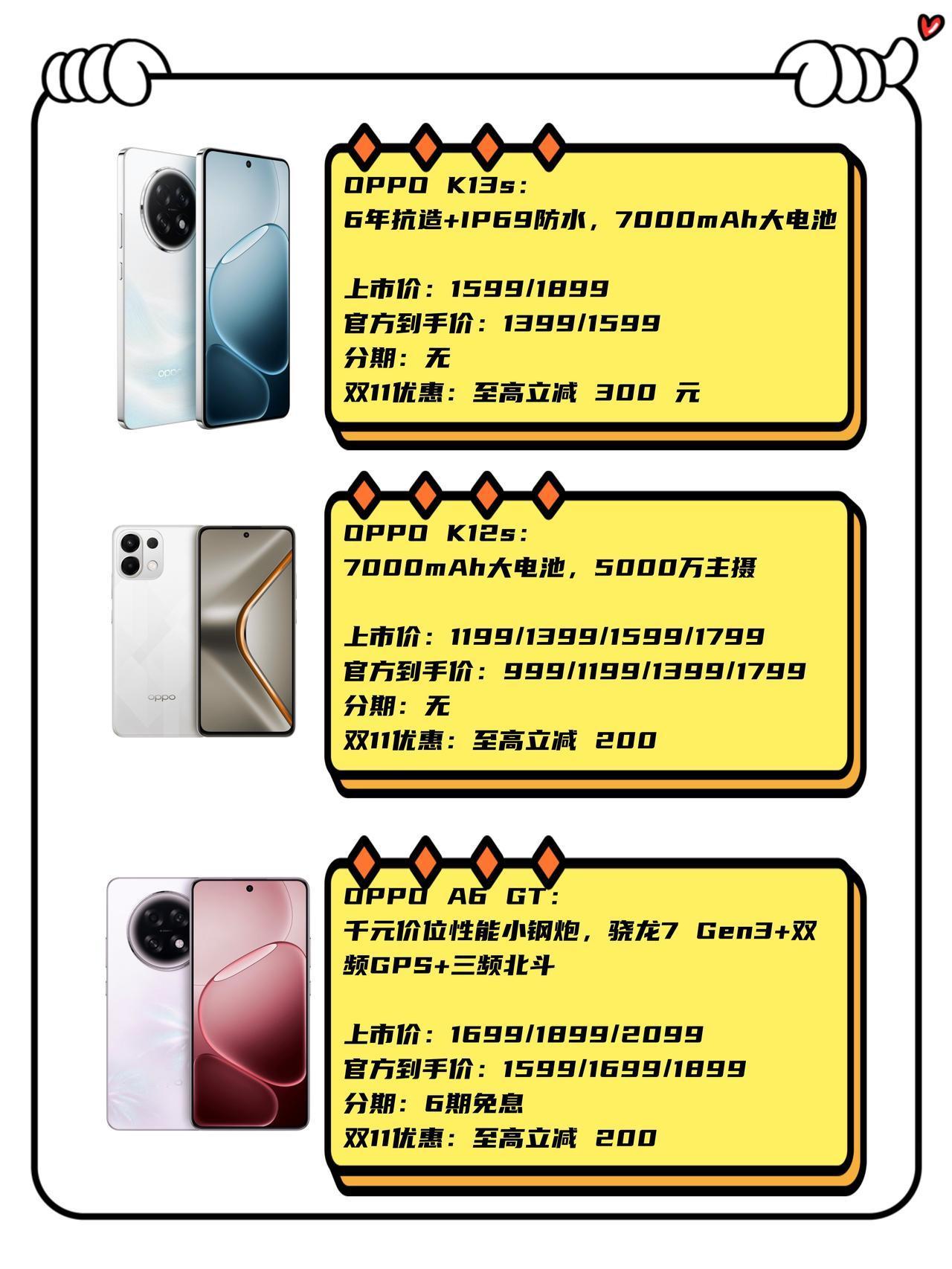 双十一6大平台抄作业!今年玩法巨简单 熬夜吐血整理,今年双十一真的不用再烧脑了! 作为年年剁手的老玩家,给大家总结了今年双十一各大平台玩法👇 🛒六大平台核心玩法+时间线⏰ 天🐱:10.15预售→11.14结束,官方立减15%不用凑单,相当于到手直接8.5折, 🐶东:10.9晚8点开抢!满300-50+国补,官方直降低至1折,买家电数码必看 拼dd:10.20-11.11,百亿补贴+阶梯式跨店满减,随时比价别犹豫 🎵音:9.16开跑连卖57天!立减折扣+一件直减(蹲大牌好价 快👋:10.7预售→11.11结束,180亿流量补贴+20亿用户红包+10亿商品补贴 小🍠:10.11预热-11.11,单品直降+立减15%起,直接站内下单超方便 ❗️今年最大变化❗️ 六大电商平台集体“抢跑”,而且平台们都学乖了! 玩法很直白,拒绝复杂算术题 全是简单粗暴的直接降价+现货发售 主打一个「不等不急,早买早享受」👍 💡双11这时候特别适合给爸妈换手机! 价格一年最低,而且新机性能足够用 🎁自用或者送长辈推荐OPPO这三款,实测好用👇 📱OPPO K13s: 6年抗造+IP69防水,淋雨/摔地都不怕,长辈用省心 7000mAh巨无霸电池,爸妈出门不用带充电宝 轻薄手感好,屏幕也护眼 💰双11至高补贴300!性价比很高~ 📱OPPO K12s: 7000mAh大电池,2天一充,学生党续航焦虑终结者 💰至高补贴200,不到1k就能拿下 📱OPPO A6 GT: 千元价位性能小钢炮,用上骁龙7 Gen3和双频GPS+三频北斗 属于“性能特种兵”,学生党或者给长辈买都合适 💰至高补贴 200,到手价可能在1.5K以下 ⚠️今年双11玩法简单,力度也大 想买的便宜的朋友记得蹲好了 PS:姐妹们今年打算蹲哪家?评论区互换攻略吖 👇
