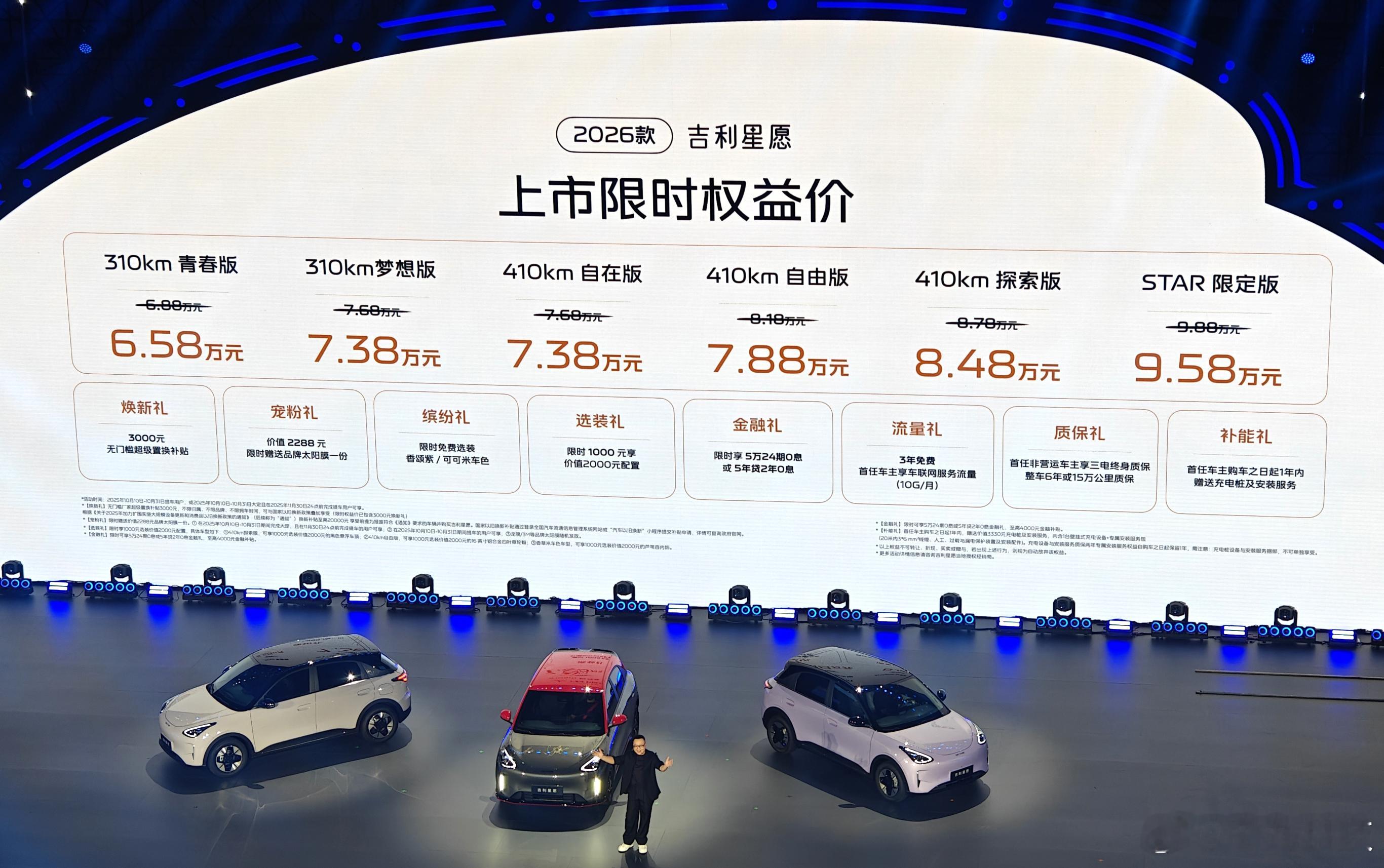 2026款吉利星愿价格也很惊喜,限时价格6.58-9.58万元!现场还推出了吉利星愿STAR限定版,首批限量发售1000台,9.58万元,大伙儿觉得怎么样?!