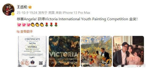 李湘王岳伦发文恭喜王诗龄李湘、王岳伦恭喜女儿王诗龄凭借绘画作品获得“维多利亚国际青少年绘画大赛”金奖。