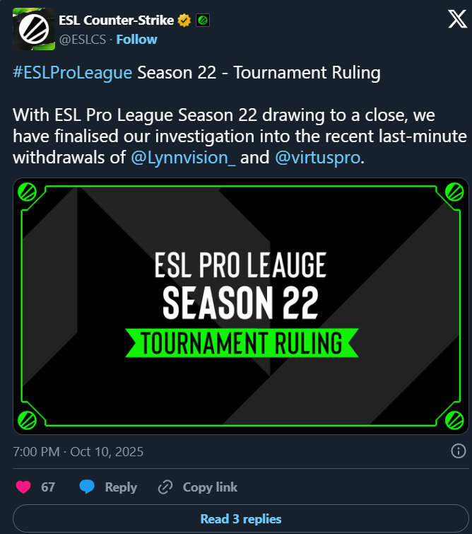基于上述规则,ESL对LVG战队处以处罚:禁止其参加原本有资格通过VRS(Valve排名系统)获得邀请的下一项S级赛事。若该战队排名足够高、可获得赛事邀请,此项处罚最早可能适用于“2026年IEM克拉科夫站”。