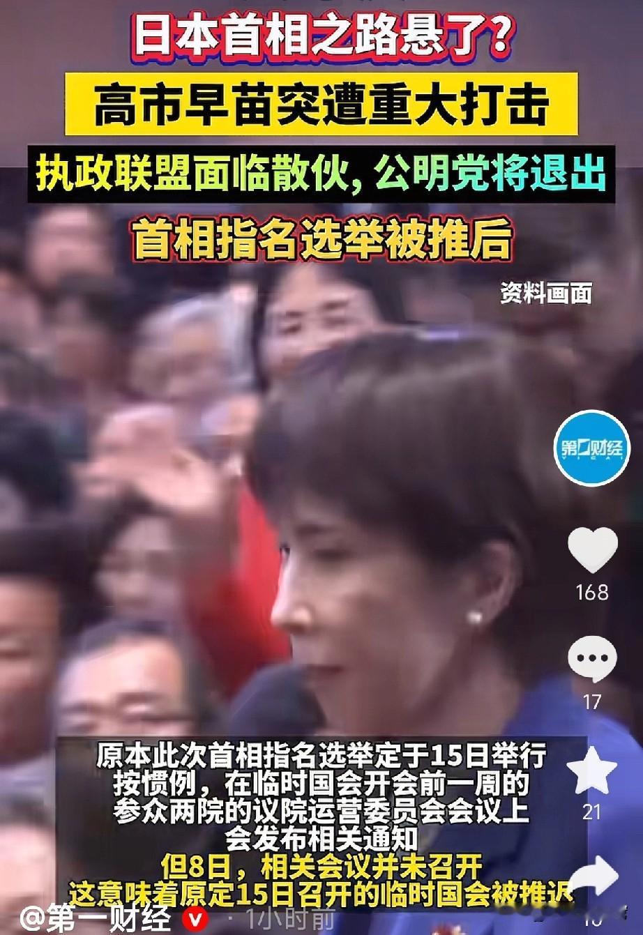 不敢惹怒中国!高市早苗被害惨了,参拜靖国神社遭到报应!首相之梦破灭,还敢惹怒中国?日本这是真的害怕了! 之前,高市早苗可以说是风光无限,不仅成为自民党总裁,而且感觉成为日本第一位女性首相也是板上钉钉的事,尽管高市早苗因为“涉华”言论和年年参拜靖国神社承受巨大的舆论压力,但是她成为日本首相之事依旧几率非常高,甚至高市早苗在多次公开活动中展现出信心满满的姿态,大有“首相之位非他莫属”的感觉。 没想到高市早苗还沉浸在“自我陶醉”中,一个消息让她的首相之梦即将破灭。 根据环球网消息10月10日消息,日本公明党决定解除和自民党执政联盟关系,也就是说,高市早苗就要失去公明党支持,再过去25年来,公明党一直保持和自民党执政联盟伙伴关系,一旦公明党退出他们的执政联盟,高市早苗在选举首相之位时,肯定达不到达标的支持率,也就是说,高市早苗首相之梦就会化为泡影。 高市早苗之所以会有如此尴尬困境,和她一直以来的“反华”言论和屡屡参拜靖国神社有直接的关系。 因为公明党历来重视和中国的关系,中国的日益强大也让公明党认为“惹不起”,近两年来,中国无论在经济上还是军事上飞跃发展,美国一系列新政让其盟国感到寒心,这也让公明党更加坚定了自己的信念,而高市早苗的思想显然和公明党背道而驶,公明党总裁齐藤明确表示,“除非新总裁符合我们秉持中间保守观念,否则无法组成联合政府”。 齐藤称,“如果自民党无法消除公明党疑虑,公明党不会支持高市早苗角逐首相”。 因此,高市早苗彼此是否能成功,希望几乎破灭,所有这一切,都是其历来作风造成的。 总之,日本“反华”势力以及各种伤害中国感情的问题,也已经受到包括日本在内的人士反对,这一切都和中国经济军事迅猛发展有直接的联系。 高市早苗如果还不能看清现实,只能说明其短视的目光,显然是不可能胜任日本首相之位的。 无论高市早苗是否成为日本首相,这对于中国发展形成不了任何影响,相反,日本如果敢于铤而走险,这也并不是什么坏事。 毕竟,今天的中国对于反华行为早就无惧,而有些历史问题,也到了彻底解决的时候,关键是看有没有这个机会。