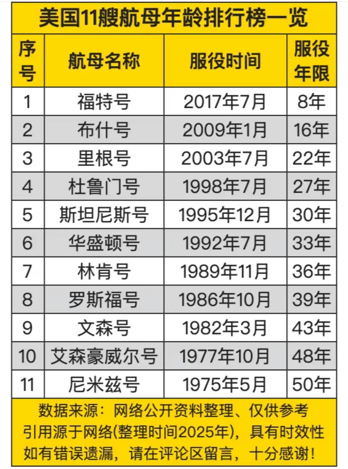 美军11艘核动力航母,能用的只有4艘!其中两艘加起来近100岁! 美军现役的11艘航母全是尼米兹级和福特级,但多数都在“趴窝”。福特级作为最新型号,首舰“福特”号2017年服役后问题不断,电磁弹射多次故障,至今没形成完整战力。 剩下10艘尼米兹级里,一半以上处于维修或训练状态,根本没法随时出动。 能调用的4艘里,“尼米兹”号和“艾森豪威尔”号堪称“老古董”。“尼米兹”号1975年服役,舰龄已49年。 “艾森豪威尔”号1977年服役,舰龄47年,两艘加起来96岁,快凑够一个世纪。虽经过多次升级,但舰体结构、动力系统的老化难以逆转,高强度部署时故障风险极高。 航母“能用的少、老的多”,核心原因是维修周期长、新舰产能跟不上。尼米兹级的中期大修加换料,一次就要3-4年。 福特级的建造更是波折不断,二号舰“肯尼迪”号多次延期,至今未正式服役。 更关键的是,美军全球部署需求压得航母喘不过气。从西太平洋到地中海,到处要靠航母撑场面,导致在役航母过度使用,维修保养进一步滞后,形成“部署-故障-维修-缺编”的恶性循环。 11艘的数量看似唬人,但“能用的仅4艘”“老舰挑大梁”的现状,让美军航母舰队的“全球霸权”光环,悄悄蒙上了一层阴影。 信源:央视网:2025年2月24日《11艘航母仅4艘可用 美国军工怎么了?》