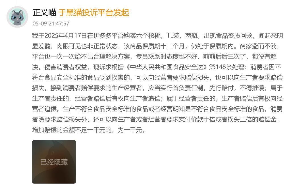 2025年5月9日,有消费者投诉称:“本人于2025年4月17日在拼多多平台购买六个核桃,1L装,两瓶,出现食品变质问题,闻起来明显发酸,肉眼可见也非正常状态,该商品保质期十二个月,仍处于保质期内。”