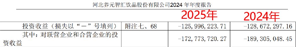 值得一提的是,养元饮品看似布局多元的投资策略,换来的确是接连的投资亏损。财务数据显示,2023年和2024年,公司投资净收益分别为-1.29亿元、-1.26亿元左右,其中对联营企业的投资收益连续两年亏损超1.7亿元。