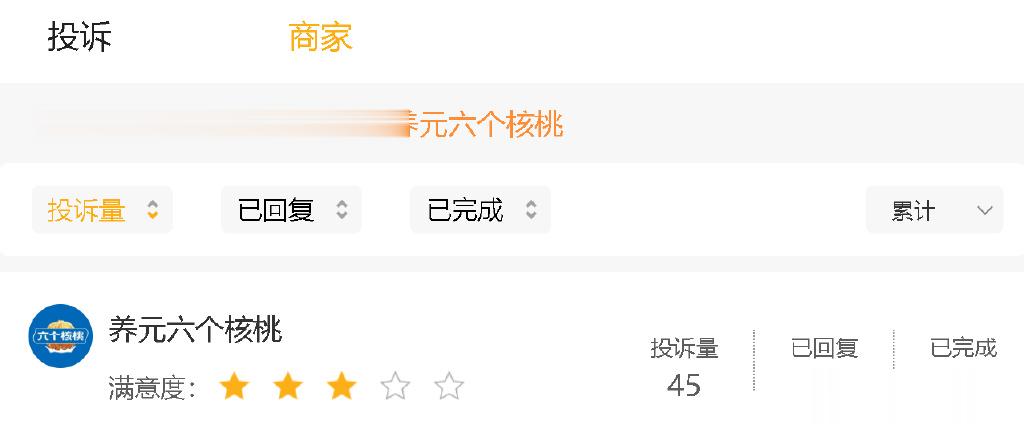 据黑猫投诉平台显示,截至2025年10月4日,关于“六个核桃”的投诉量为45条,但已回复量与已完成量分别为12条、11条。问题集中于食品变质、异物掺杂、售后推诿等核心痛点。