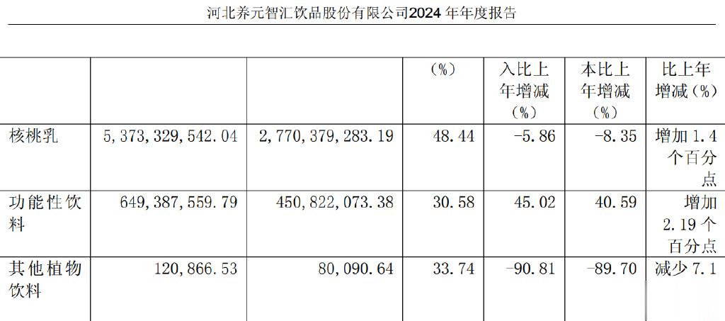 财报显示,养元饮品2024年核桃乳仍贡献53.7亿元的营收,占总营收比例大致为89.20%,而功能性饮料、枸杞饮品等新品的营收占比刚过10%,多元化尝试收效甚微。