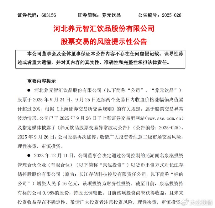 面对市场热炒,养元饮品紧急发布风险提示,坦言对长江存储控股有限责任公司(下称“长控集团”)的投资“尚未获得收益,未来收益不确定”,且明确表示此举仅为财务投资,不参与经营、无业务协同。而对于市场猜测的跨界转型方面却并没有任何解释。