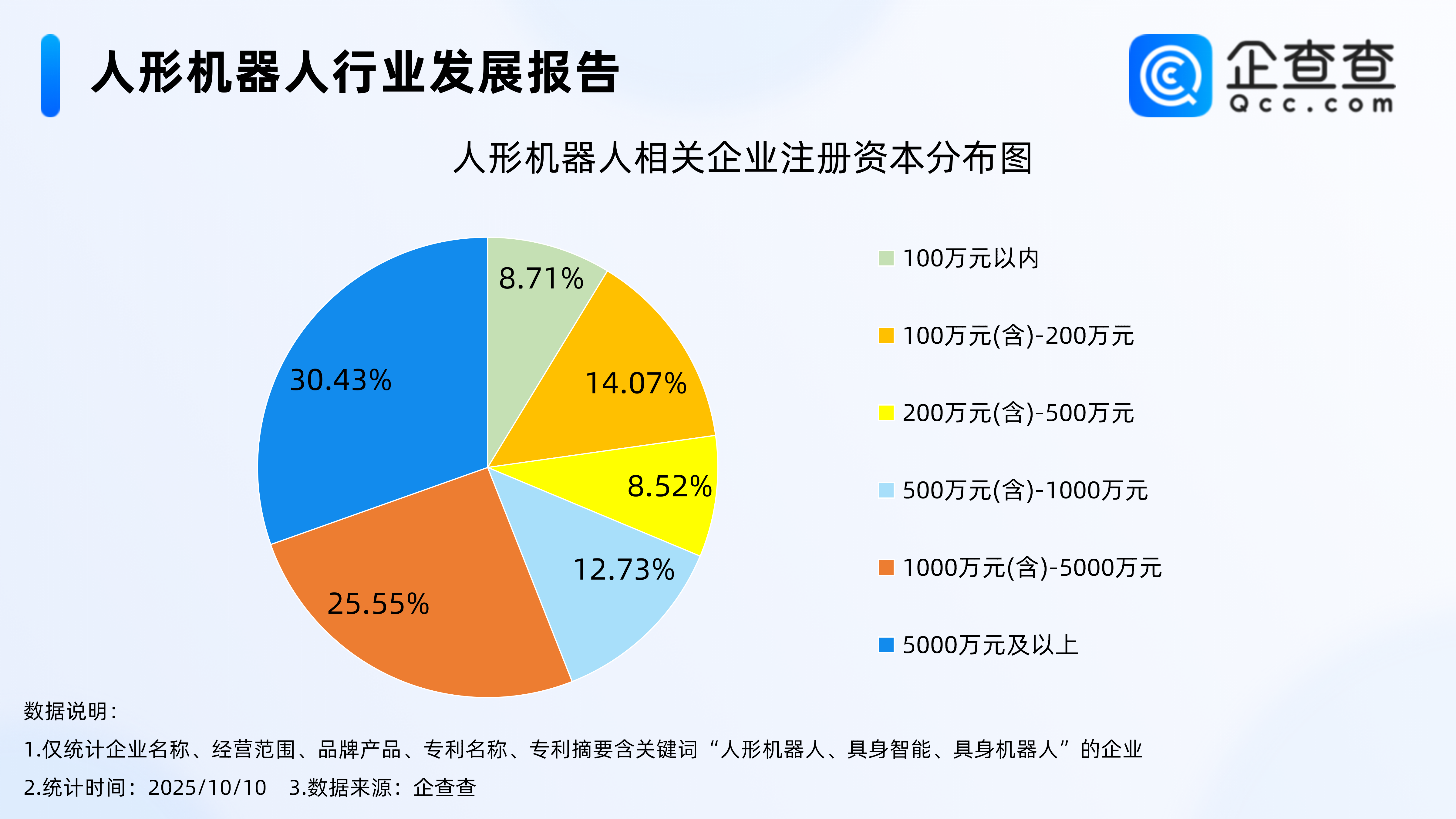 企查查数据显示,从注册资本来看,人形机器人相关企业多为资金密集型企业,注册资本千万级及以上的企业占比过半,其中注册资本在5000万元及以上的相关企业最多,占比30.43%。其次,注册资本在1000万元(含)-5000万元的相关企业占比25.55%。