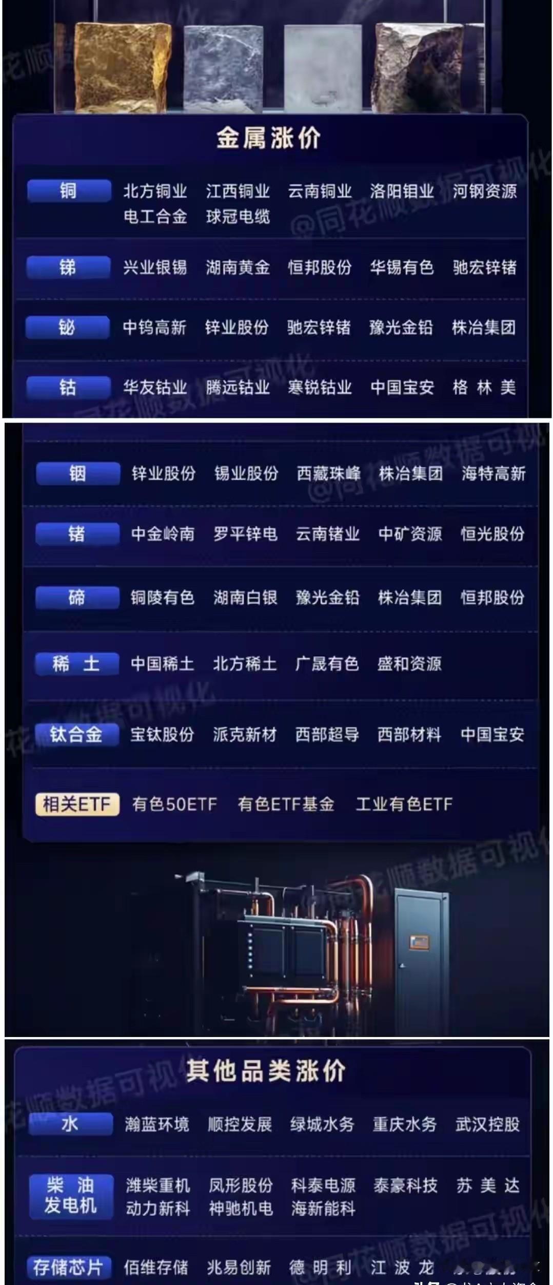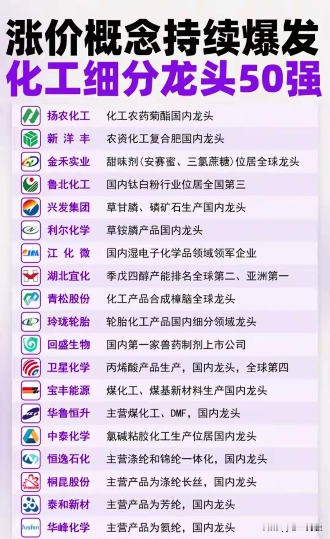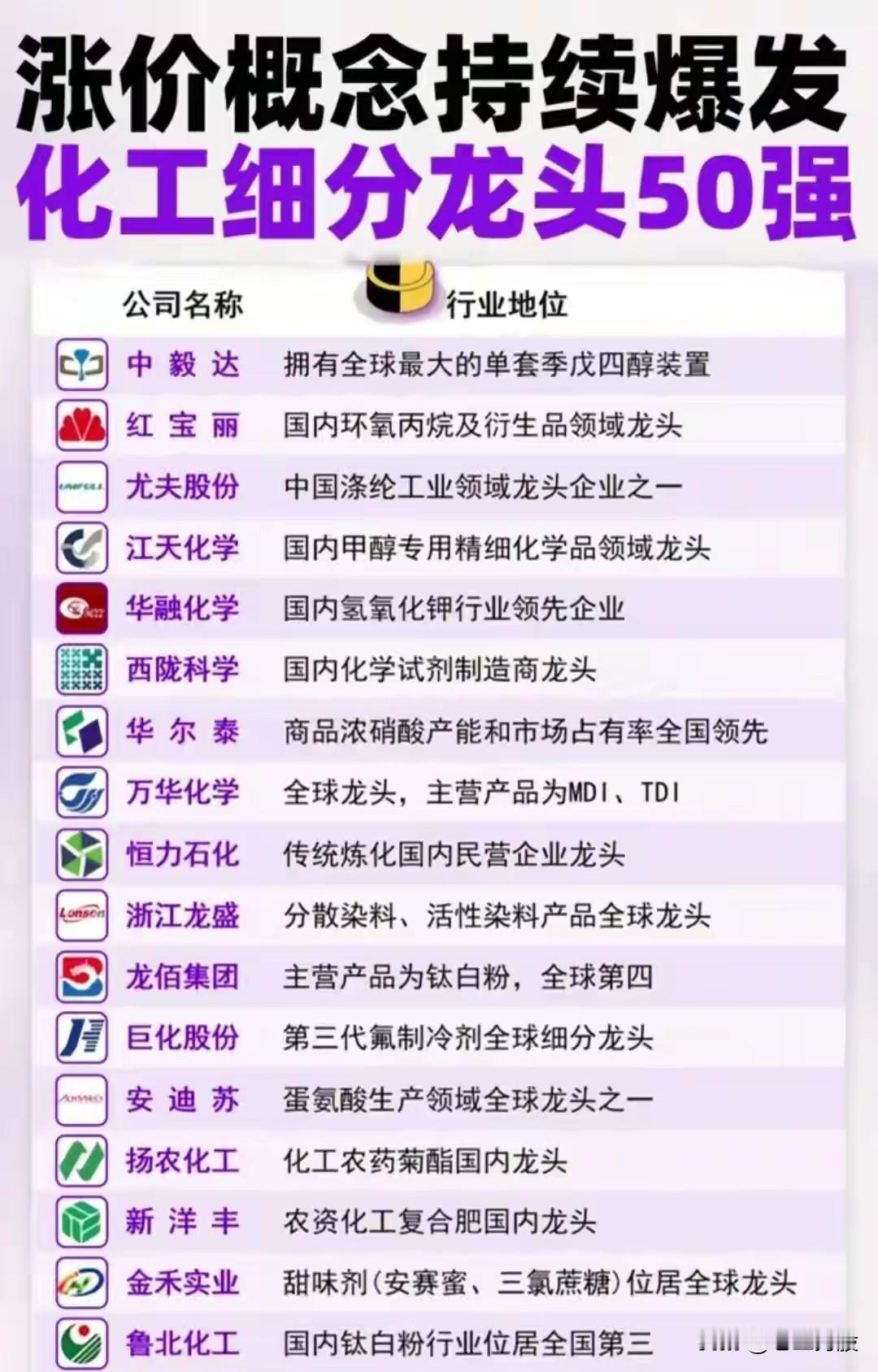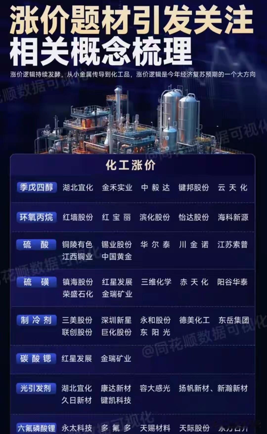 “涨价概念”,聚焦于化工及部分金属、大宗商品领域,集中展示了当前市场上因供需变化或经济复苏预期而出现价格上行的细分行业及其代表性龙头企业。 一、化工细分领域涨价与龙头企业概况 1. 主要细分领域及代表企业 - 氨纶:华峰化学,国内龙头; - 涂料:三棵树,国内龙头; - 橡胶助剂:阳谷华泰,防焦剂CTP领域龙头; - 表面活性剂:丽臣实业,产销量龙头之一; - 食品级二氧化碳:凯美特气,国内细分领域龙头; - 丙烯化工:渤海化学,行业标杆性龙头; - 生物柴油:卓越新能,国内细分龙头; - 彩色聚合碳粉:鼎龙股份,国内唯一生产企业; - 醋酸:江苏索普,国内龙头; - 化肥:鲁西化工,国内规模最大的化肥生产基地之一; - 碳纤维:光威复材,国内龙头; - 六氟磷酸锂:多氟多,全球龙头; - 铝晶粒细化剂:深圳新星,全球龙头; - 蒽醌结构染料/还原染料:亚邦股份,全球龙头; - 光刻胶用光引发剂:强力新材,全球电子化学品龙头; - 氮肥/甲醇:赤天化,国内龙头; - 氯酸钠:恒光股份,国内行业领先; - 煤制乙二醇:丹化科技,国际技术龙头; - 农药菊酯:扬农化工,国内龙头; - 复合肥:新洋丰,国内龙头; - 甜味剂(安赛蜜、三氯蔗糖):金禾实业,全球龙头; - 钛白粉:龙佰集团,全球第四;鲁北化工,全国第三; - 草甘膦/磷矿石:兴发集团,国内龙头; - 草铵膦:利尔化学,国内龙头; - 湿电子化学品:江化微,国内领军企业; - 季戊四醇:湖北宜化(全球第二、亚洲第一)、中毅达(全球最大单套装置)、金禾实业、键邦股份、云天化; - 环氧丙烷及衍生品:红宝丽,国内龙头; - 甲醇精细化学品:江天化学,国内龙头; - 氢氧化钾:华融化学,行业领先; - 化学试剂:西陇科学,国内龙头; - 浓硝酸:华尔泰,产能与市占率全国领先; - MDI/TDI:万华化学,全球龙头; - 传统炼化(民企):恒力石化,国内龙头; - 染料(分散/活性):浙江龙盛,全球龙头; - 钛白粉:龙佰集团,全球第四; - 氟制冷剂(第三代):巨化股份,全球细分龙头; - 蛋氨酸:安迪苏,全球龙头之一; - 氯碱/粘胶化工:中泰化学,国内龙头; - 涤纶/锦纶一体化:恒逸石化,国内龙头; - 涤纶长丝:桐昆股份,国内龙头; - 芳纶:泰和新材,国内龙头; - 丙烯酸:卫星化学,国内龙头、全球第四; - 煤化工/煤基新材料:宝丰能源,国内龙头; - DMF/煤化工:华鲁恒升,国内龙头; - 制冷剂:三美股份、联创股份、深圳新星、巨化股份、东阳光; - 碳酸锂:红星发展、金瑞矿业; - 光引发剂(用于光刻胶等):湖北宜化、久日新材、康达新材、容大感光、扬帆新材、新瀚新材; - 六氟磷酸锂:永太科技、多氟多、天赐材料、天际股份、东方日升。 2. 共同特点这些企业普遍在其主营的化工细分领域内具有显著的市场份额、技术优势或产能规模,是推动相关化工产品价格上涨的重要力量,也是资本市场关注的重点标的。 二、化工涨价逻辑与相关产品梳理 - 季戊四醇:湖北宜化、金禾实业、中毅达、键邦股份、云天化; - 环氧丙烷:红宝丽、红墙股份、滨化股份、怡达股份、海科新源; - 硫酸:华尔泰、川金诺、江苏索普; - 硫磺:镇海股份、红星发展、三维化学、赤天化、阳谷华泰; - 制冷剂:三美股份、联创股份、深圳新星、巨化股份、东阳光; - 碳酸锂:红星发展、金瑞矿业; - 光引发剂:湖北宜化、久日新材、康达新材、容大感光、扬帆新材、新瀚新材; - 六氟磷酸锂:永太科技、多氟多、天赐材料、天际股份、东方日升。 这些产品的涨价,既反映了下游需求的回暖,也受到原材料成本、供给收紧等多重因素影响,相关上市公司因此成为市场关注的热点。 三、金属及其他品类涨价情况 - 金属涨价:包括铜(如北方铜业、江西铜业)、锑、铋、钴等,同时列出了相关ETF(如有色50ETF、有色ETF基金、工业有色ETF),反映有色金属作为基础工业原料,在经济复苏周期中的涨价预期和资金关注度。 - 其他品类涨价:涵盖水(如瀚蓝环境)、柴油发电机、存储芯片(如佰维存储、兆易创新、德明利、江波龙、东芯股份)等,显示涨价逻辑不仅局限于化工和金属,还延伸至能源、电子元件等多个领域,进一步印证了经济复苏预期下各类基础与高端物资价格上行的广泛性。