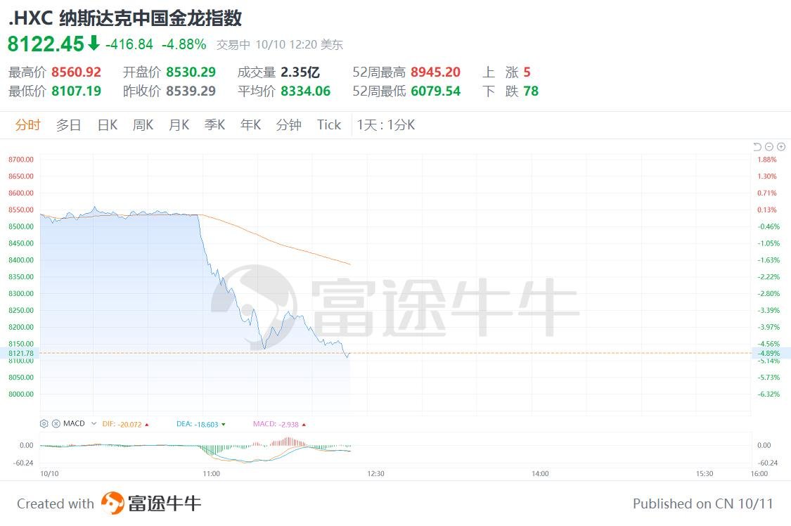 格隆汇10月10日|中概股集体跳水,纳斯达克中国金龙指数跳水跌超5%。其中,迅雷跌超12%,文远知行、万国数据、金山云跌超10%,晶科能源跌超9%,哔哩哔哩、向上融科跌超8%,小鹏汽车、阿里巴巴、百度跌超7%,京东跌超5%。